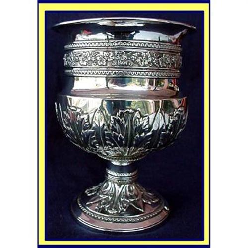 George III sterling silver vase, made London 1810 by Alexander Hewat.<BR>Measures a little over 6inches tall; diameter of top is 4 3/8inches. Weight is 400g - 14 1/2oz.<BR>Campana-shaped with outflared and rolled rim. The top half of the body moulded with a broad band of fruiting vines between stylised egg-and-dart borders, the lower half decorated with acanthus leaves, on a similarly decorated pedestal foot. Silver-gilt interior.<BR>Very clearly hallmarked on the bottom rim:Maker AH; lion passant, leopard, date letter P and monarch's head.<BR>Small dent to rim but otherwise very good condition.