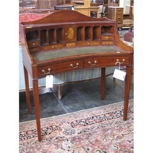 WRITING DESK: Georgian style mahogany writing desk, crossbanded and oval inlay, gilt tooled green leather writing surface, sqaure tapered legs. 46''h x 21''d x 39''w