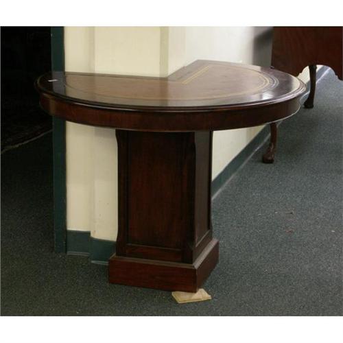 DESK: Georgian style rosewood circular desk with brown gilt tooled leather top. 30''h x 39'' diameter.