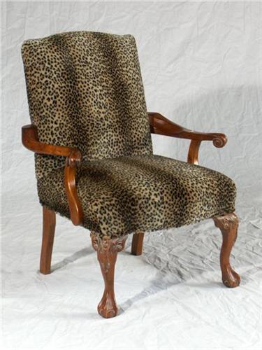 ARMCHAIR: Georgian style walnut armchair, ball and claw feet, carved knees, faux leopard skin fabric.