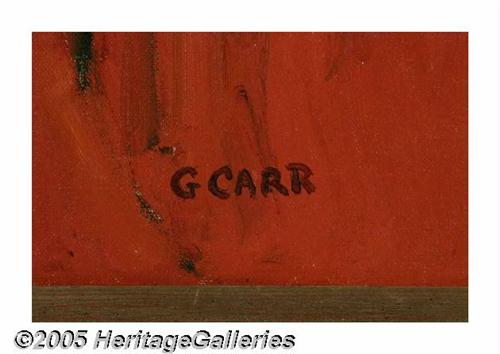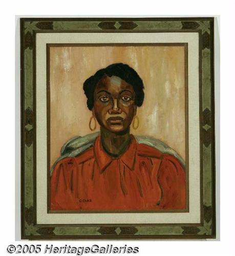 <B>GEORGIE CARR (American 20th Century)</B></I><BR>Portrait of Black Woman<BR>Oil on canvas<BR>24in. x 20in.<BR>Signed 'G Carr' lower left<BR><BR>Condition Report: Canvas is beva-lined, no inpainting noticed, some stretcher indentation marks<BR>