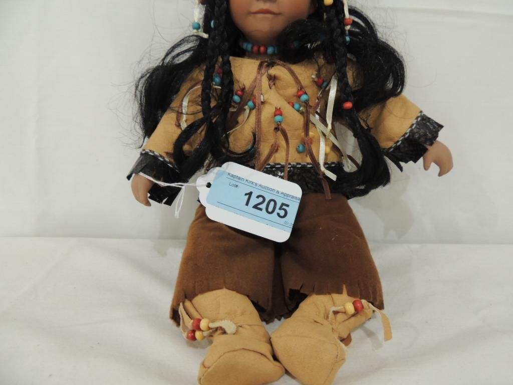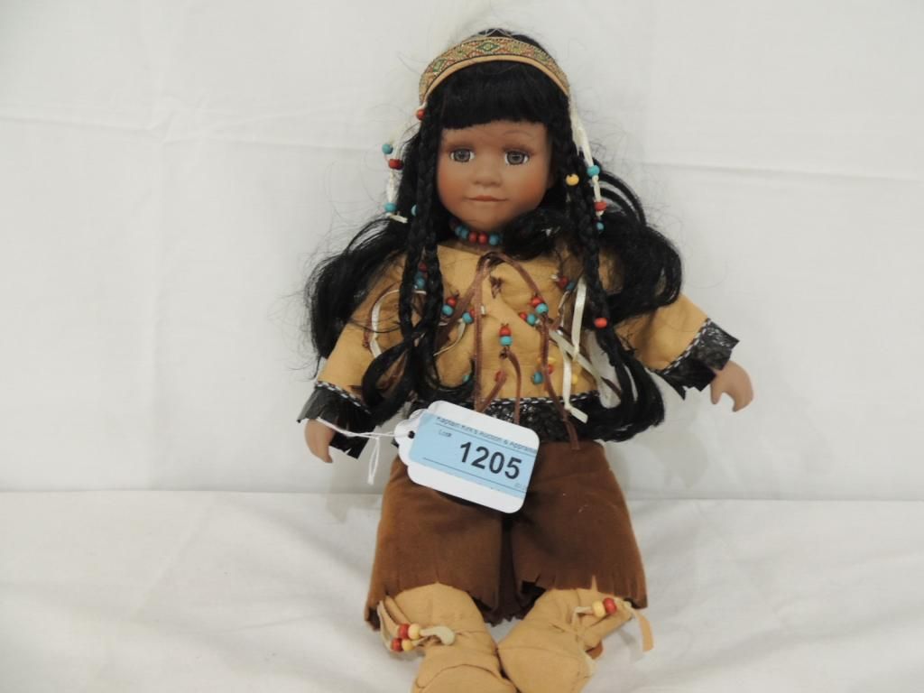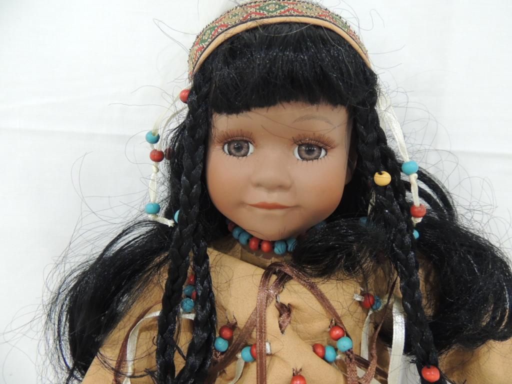 AMERICAN INDIAN PORCELAIN DOLL. 14'" TALL AS SHOWN SEE PHOTO FOR MORE DETAILS.