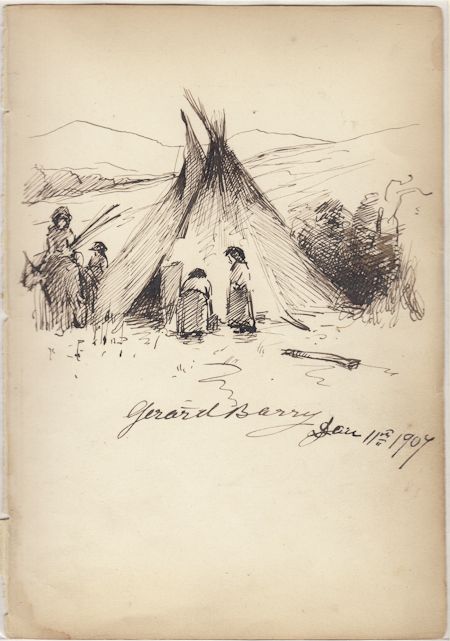(1864-1941) American artist best known for his landscape, portrait and harbor views. Original vintage signed pen and ink and watercolor drawing on a white 5" x 7" sheet, depicting a few Native Americans performing various chores around a teepee. Signed "Gerald Barry, 1907". In fine condition, with faint toning and soiling at the edges, notches to the left margin where removed from notebook. Simply matted and ready to frame.