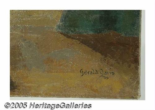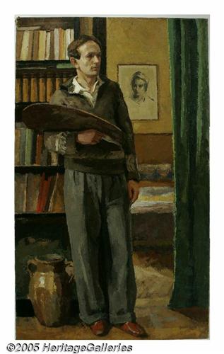 <B>GERALD VIVIAN DAVIS (American 1899-1987)</B></I><BR>Portrait of the Artist, 1939<BR>Oil on canvas<BR>63in. x 37.75in.<BR>Signed lower right<BR><BR>Condition Report: Painting has been beva-lined and restretched on a new stretcher, large (12in.) horizontal tear crossing through background drawing and into right arm of figure finely inpainted, another tear (4in.) on left edge approx. 24in. from bottom inpainted, small tears in legs of pants repaired and inpainted, minor inpainting under chin and small tear in left hand retouched.<BR><BR>Brian Roughton: The painting is by G. V. Davis. Signature is fluorescent under ultraviolet light, but not abraded.<BR>
