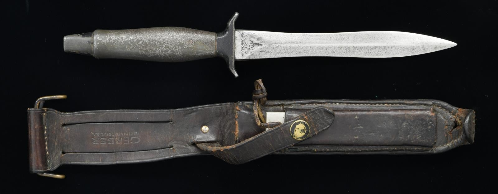 HOSPITAL CORPSMAN, WITH SCABBARD & PROVENANCE. The double edged spear point wasp waisted blade measures 6 3/4" from the tip to the handguard, with the knife measuring 11 7/8" overall. Blade is engraved, with only some text remaining legible and reading "CE N NYLAN" over "A 12 750 058". Ricasso is hand etched "L.N." above the serial number "001609", with the Gerber's logo and information on opposite side. Original brown leather scabbard retains its sharpening stone. UNATTACHED ACCESSORIES: a handwritten letter dated October 24th of 1986 from U.S.M.C. Hospital Corpsman Larry Nyland that mentions that the knife is in the same condition as it was when he brought it home from Vietnam, that it was difficult to keep the knife from rusting, and that he "worked off a lot of nervous tension sharpening the knife". The letter goes on to list several items that Larry Nyland was interested in trading his knife for. Larry Nyland's U.S.M.C. business card is taped to the letter, and is accompanied by a 3rd Recon Batallion "SWIFT" "SILENT" "DEADLY" patch and original Gerber Mark II combat knife pamphlet. CONDITION: blade shows pitting and some scattered pinprick spots of darker discoloration overall. Handle shows losses to its finish and retains a gray patina. Leather scabbard shows some age related cracking and crazing overall, with some scattered marks from handling and storage. Brass hanger retains a pleasant mellow patina. An already desirable Gerber Mk2 fighting knife, with a letter from the Veteran who carried it in Vietnam. PROVENANCE: From the Lifelong Collection of Glen E. Mattox. (02-18477/MLW). $500-700