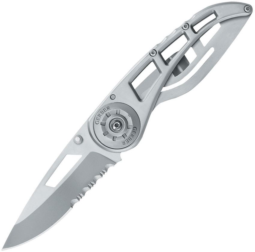 4 3/8" closed framelock. 3" partially serrated 440A stainless drop point blade with bead blast finish and dual thumb studs. Skeletonized stainless handles with bead blast finish. Stainless pocket clip.