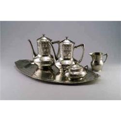 GERHARDI & CIE., Lüdenscheid Albert Reimann Kaffee-Service, Zinn. 5-tlg., bestehend aus 2 Kaffeekannen, 1 Sahnekännchen, 1 Zuckerdose und 1 Tablett. Linien- und Wellendekor in Relief. Kannen über ovalem Grundriss stark gebaucht mit abgerundeter Schulter, zylindrischem Hals mit gewölbtem, scharniertem Deckel mit Knauf, angesetztem, spitz zulaufendem Henkel mit Isolierscheiben und Röhrenausguss. Form und Dekor von Sahnekännchen wie Kanne, nur mit ausgezogenem Ausguss ohne Deckel, Zuckerdose mit zwei Henkeln und Deckel wie Kannen ohne Scharnier. Das länglich ovale Tablett mit zwei Handhaben. H.: 10,7 - 23 cm, L.: 29 cm. Bez.: Firmenmarke, Mod.Nr. 1810, eine Kanne mit Gravur GB. Um 1900