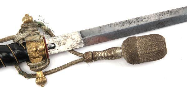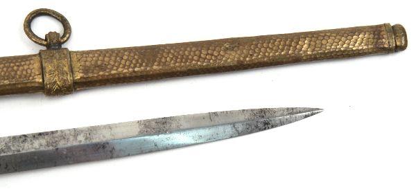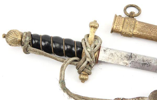 German Weimar Republic Navy 1921 Pattern naval dirk, with portepee. Blade just over 9 inches, with no makers mark. Black celluloid grip, with twisted brass wire wrap. Brass-plate over copper pommel and quillon fittings, and hammered brass scabbard with two hang rings. Slight discoloration to blade, minor fraying on portepee chord, minor dings to scabbard. Celluloid grips in very good condition, with pommel and quillon retaining most of brass plating. Overall very good condition.