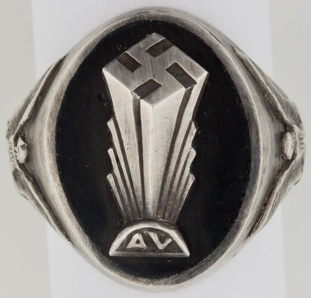 A fine and unusual relic of the German-American Bund, a silver man's ring produced by Franz Schnell that bears a black enameled top with the "AV" symbol and the American federal eagle on both sides. It measures about 1" tall and is hallmarked on the band .835 for silver content. The German-American Bund organization was formed out of the ”Friends of the New Germany”. This organization was made up of German Americans bearing strong racial and nationalistic feelings stirred-up when Hitler was elected chancellor. The members wore uniforms, sang the Horst Wessel Lied, and flew the swastika flag, and as a result soon fell out of favor within the U.S. Its leaders, largely German nationals, were recalled to Germany and in 1936 the German-American Bund, or Amerikadeutscher Volksbund (AV) was organized. Very good condition overall.