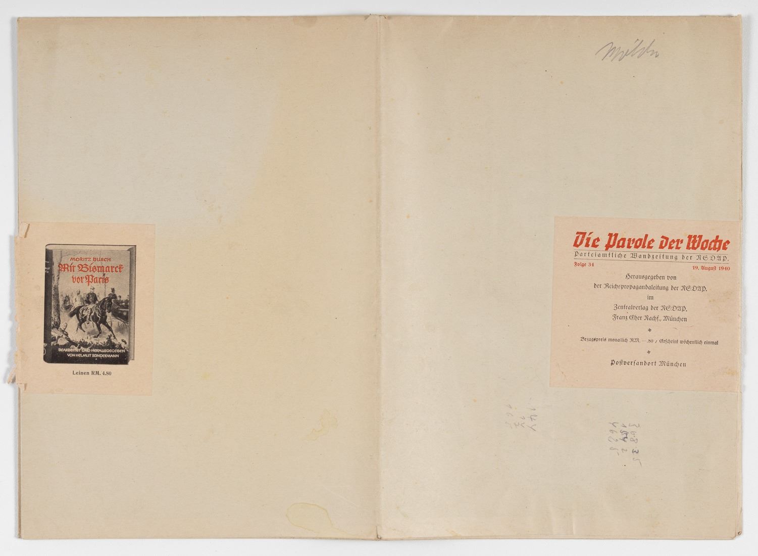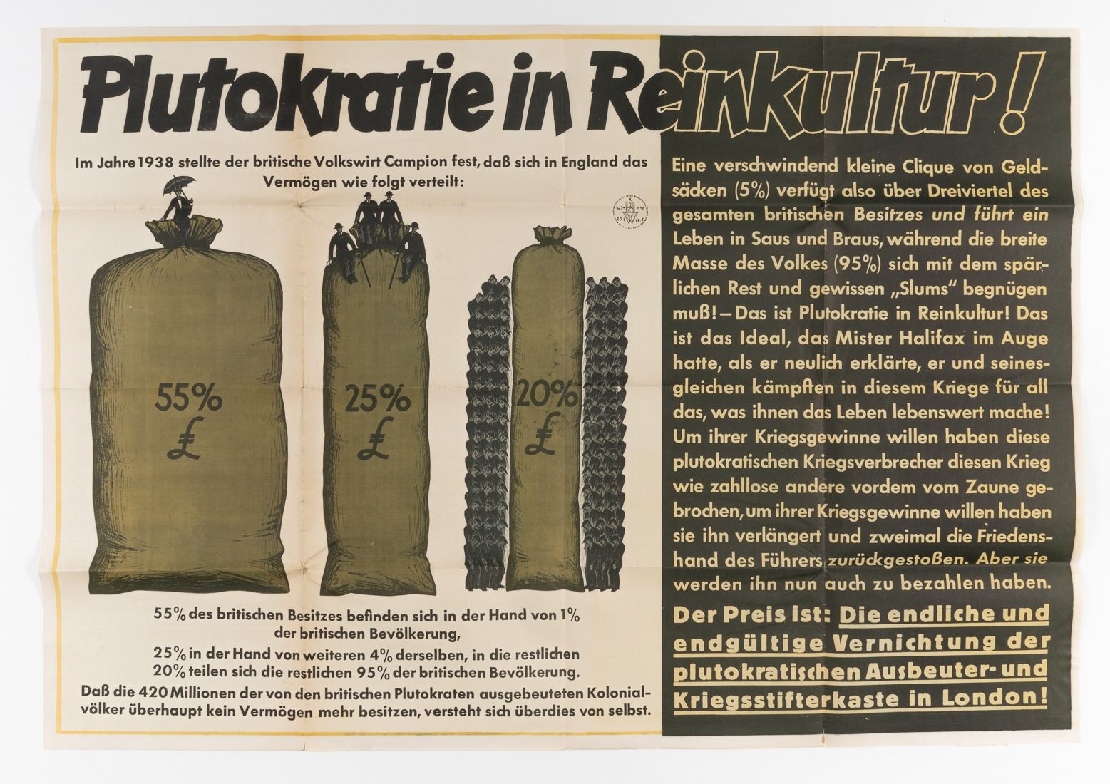 GERMAN ANTI-BRITAIN PROPAGANDA POSTER PAROLE DER WOCHE German WWII anti-Britain propaganda poster - Parole Der Woche - warning of the 'final and definitive annihilation of the plutocratic exploiters and warmongers in London', an issue of 'Parole der Woche' ('Slogan of the Week'), produced by the Reichspropagandaleitung der NSDAP (propaganda department). The poster depicts three large bags of money representing the percentage of all British wealth. It conveys that in 1938, 55% of all British wealth was concentrated in the hands of 1% of the British population, whereas 95% of the population owned a mere 20% of the entire wealth. Folge 34, 19.August 1940, 46.5 x 32.75 inches. Mailing folds.
