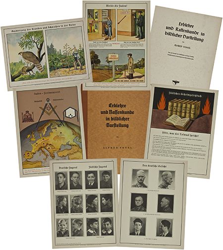 Propagandistic anti-Semitic German high school teaching aid, "Erblehre und Rassenkunde in bildlicher Dartstellung" ("Pictorial Representation of Heredity and the Science of Race"), by Alfred Vogel, illustrations by Eberhard Brauchle (Stuttgart: Verlag fur nationale Literatur Gebr. Rath), 1938. 71 seperate plates, most illustrated in color, each 11 1/2" x 15 1/2". This volume was produced as a teaching aid to introduce "new" discoveries in genetics and their application to racial science to high school students. The foreword touts the volume as: "...the best way to educate youth in our current and future fight for the total rejection of Jewry...". In a very clever manner, the plates and text progress from showing plants and their pollination, showing the products of cross-breeding of various colored plants, corn, wheat, etc. through the use of diagrams and illustrations, also taking into account environment. It then proceeds to introduce humans into the equation, illustrating that "sick" parents produce "sick" children, and including those who are deformed, mentally retarded, murderers, etc. The geographic proximity of those with "undesireable" character traits to each other in a reproductive sense is also explored. One plate sums up the evils previously explored: flight from the land, big-city living, and reduction of the birth rate will all lead to the death of the population. The flight of the population eastwards into the cities is examined, as is reasons for the reduction of the birth rate. By Plate 42, the text is examining the importance of "the eradication of the sick and the weak in nature", depicting a man cutting down a dead tree and a hawk consuming a rabbit. The second part of the text, "Race Science", commences at Plate 49. Two plates show the faces of various German "faces", with another plate showing the Jews as a mix of races including Blacks and Asians. Another plate compares photo portraits of German and Jewish youths, yet another compares their mentalities: "The Jews are always wandering...and greedy...". Other plates depict Jews "flooding" into Germany, dominating industry, Jews "misrepresenting" and "poisoning" German art, literature and theater, attacks on the Talmud, associations between Jews and Freemasons, results of mixed marriages, and effects of race laws. The last plate, titled: Avoid the Jews!", shows "typical" Germans regarding signs and slogans reading: "Aryan Business...Buy only from Germans...Only go to the German doctor...Where the Jew reigns, the Farmer dies!". In hard cover portfolio with black printed title, very good to fine.