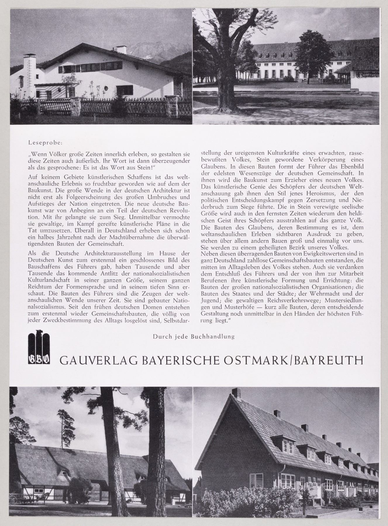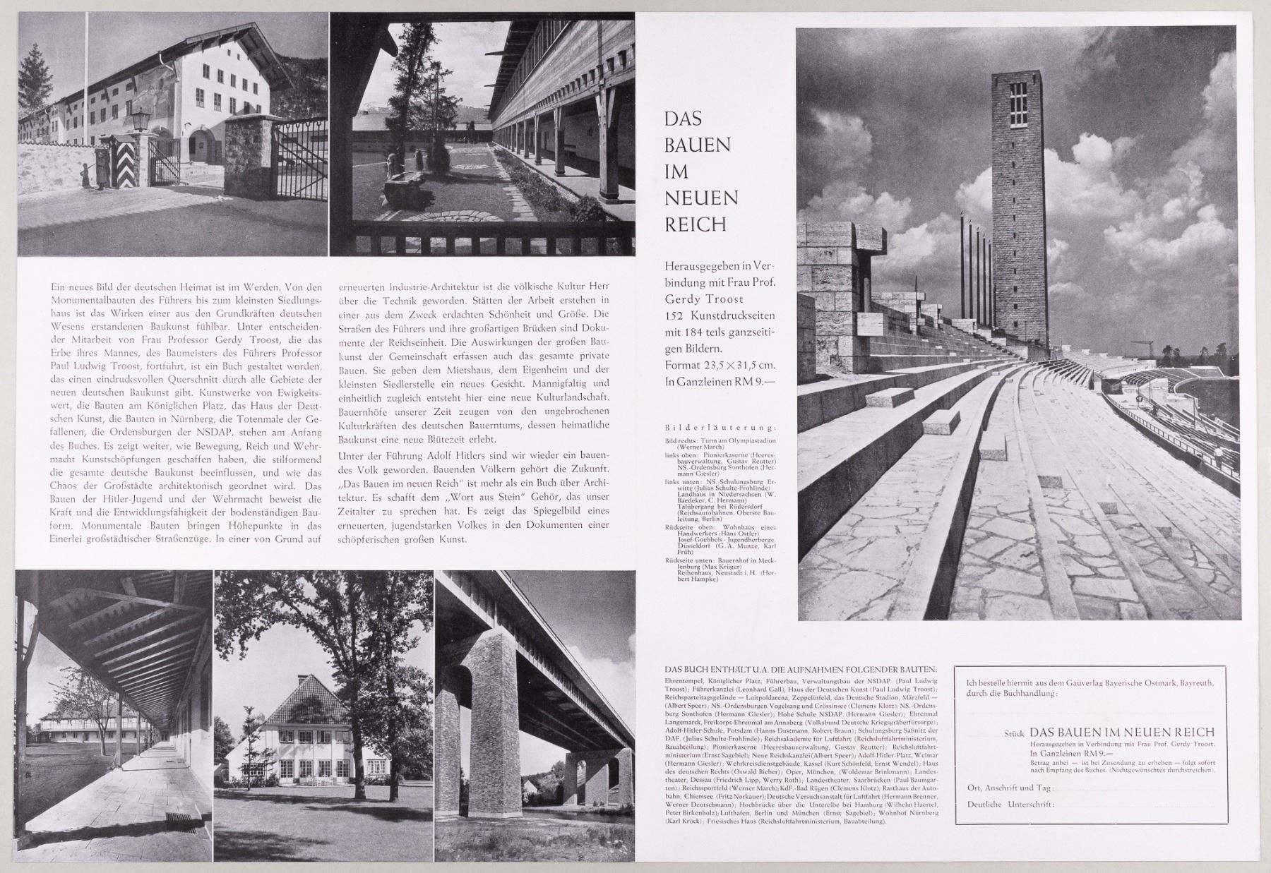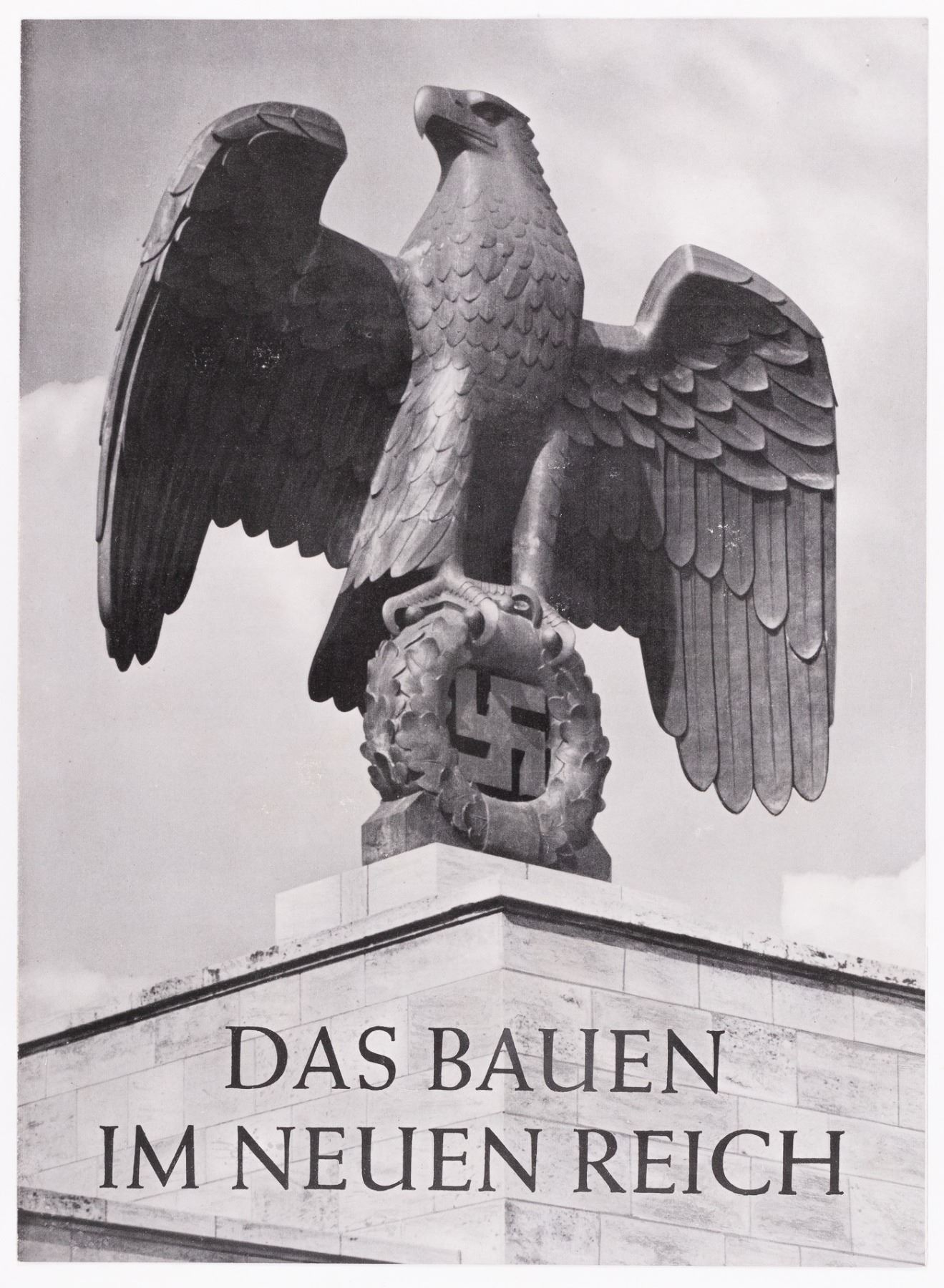 Scarce advertising brochure for the book 'Building in the New Reich' (Bauen Im Neuen Reich) by Professor Gerdy Troost. The covers shows a full page photograph of the monumental German eagle created by German sculptor Kurt Schmid-Ehmen for the Reich party rally grounds. Four pages, 12.5 x 9 inches.