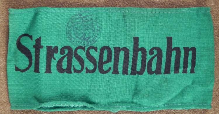 GERMAN ARMBAND "STRASSENBAHN"-STREETCAR OPERATOR ARMBAND-WITH CITY INK STAMP * GREEN WITH BLACK LETTERING-ORIGINAL *