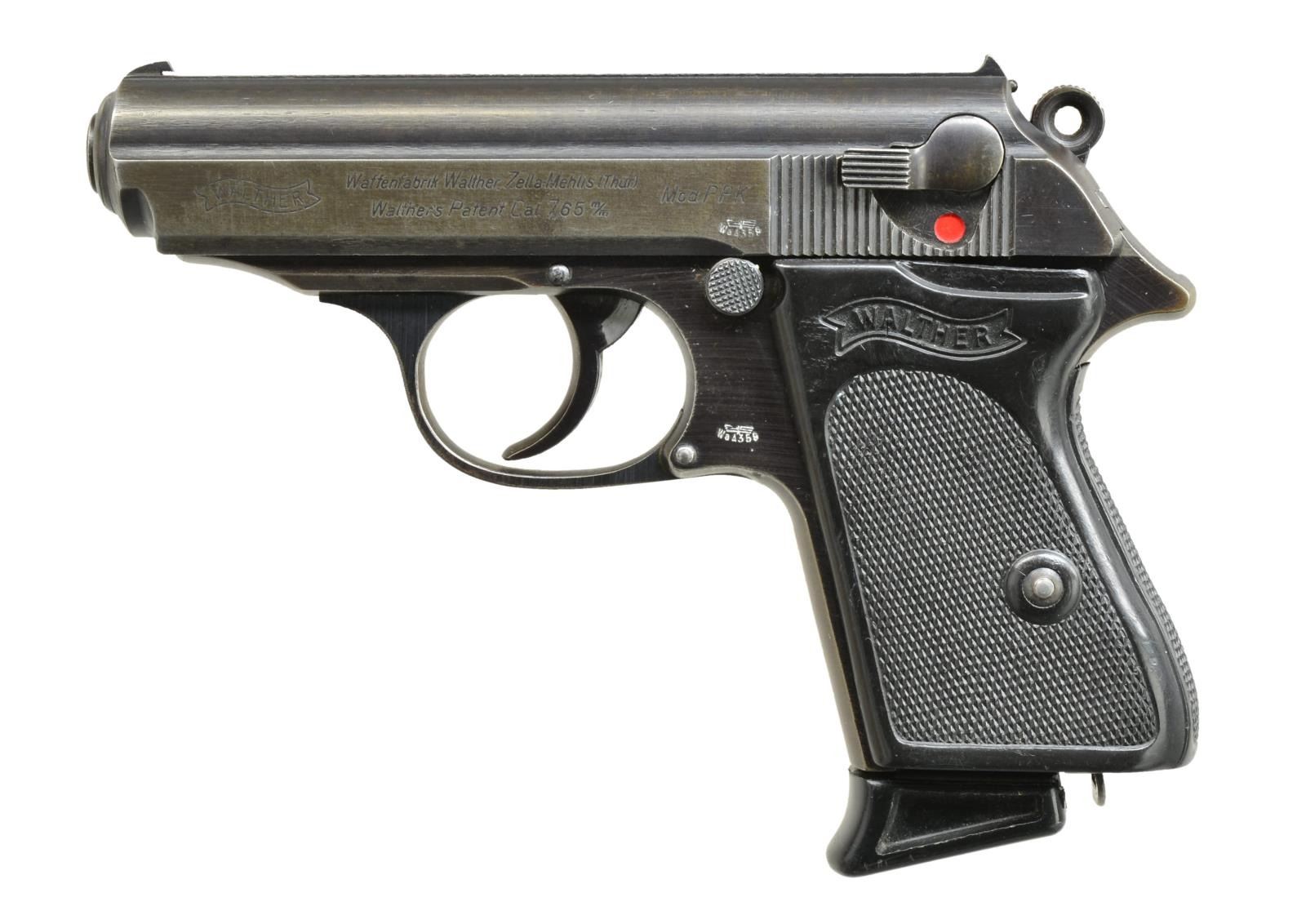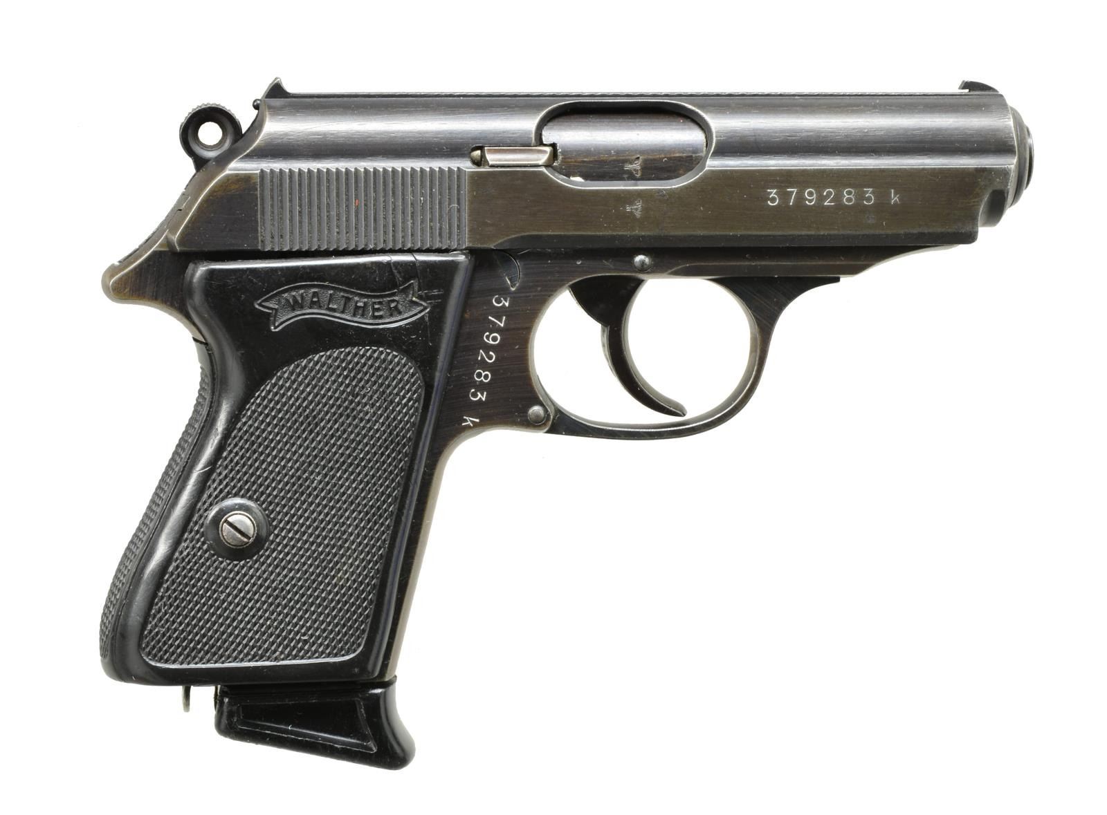 VARIATION WALTHER PPK. Cal. 7.65mm. S# 379283K. Standard configuration w/ eagle “N” proofs on blued bbl., chamber & muzzle as well as serial numbered slide (eagle & “WaA 359” is on left side of slide & frame). Black plastic wraparound grips. Mag. marked w/ Walther banner & “PPK 7.65m/m” has plastic finger extension. Est. 12,500 procured by German army. CONDITION: very good. Metal parts retaining most of their satin blue fading to considerable brown overall. Grips are good w/ some shrinkage. Bright shiny bore. Mechanically good. Wear on mag. matches pistol well. (20-3211/MGM). CURIO. $1,200-1,800.
