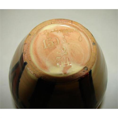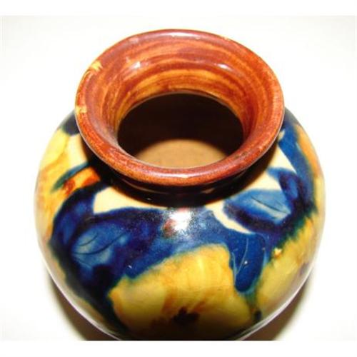 GERMAN ART POTTERY CABINET VASE. Decorated with yellow, cobalt blue, brown, and tan floral decoration. Marked on bottom “Germany/1506/2/34”. 4” H