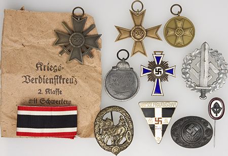 Lot of ten badges, medals and tinnies, includes an War Merit Cross with Swords, with ribbon and original envelope (torn and wrinkled), a War Merit Cross, War Merit Medal, S.A. Sports Badge by W. Redo, Ostfront medal, Mother's Cross, NSDAP Frauenschaft pin (damaged), two pins, apparently Arbeitsdienst-related, and a bronze German Horse Driver's badge. Ten pieces, condition varies.
