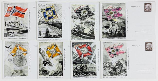 Fine grouping of eight unused color postcards commemorating various Wehrmacht battle standards and flags, including paratroopers, Kriegsmarine, coastal defense, SS, infantry, Luftwaffe, etc. Fine.