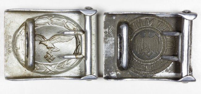 Pair of German belt buckles, includes Luftwaffe buckle marked "R S & S", and a Heer buckle, worn. Two pieces.