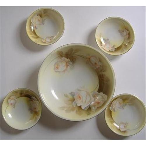 SET IS MINT! THIS BERRY BOWL SET HAS HAND PAINTINGS OF WHITE ROSES WITH A TOUCH OF PEACH. THE BACKDROP IS WHITE WITH YELLOW WASH AND GREEN LEAF.