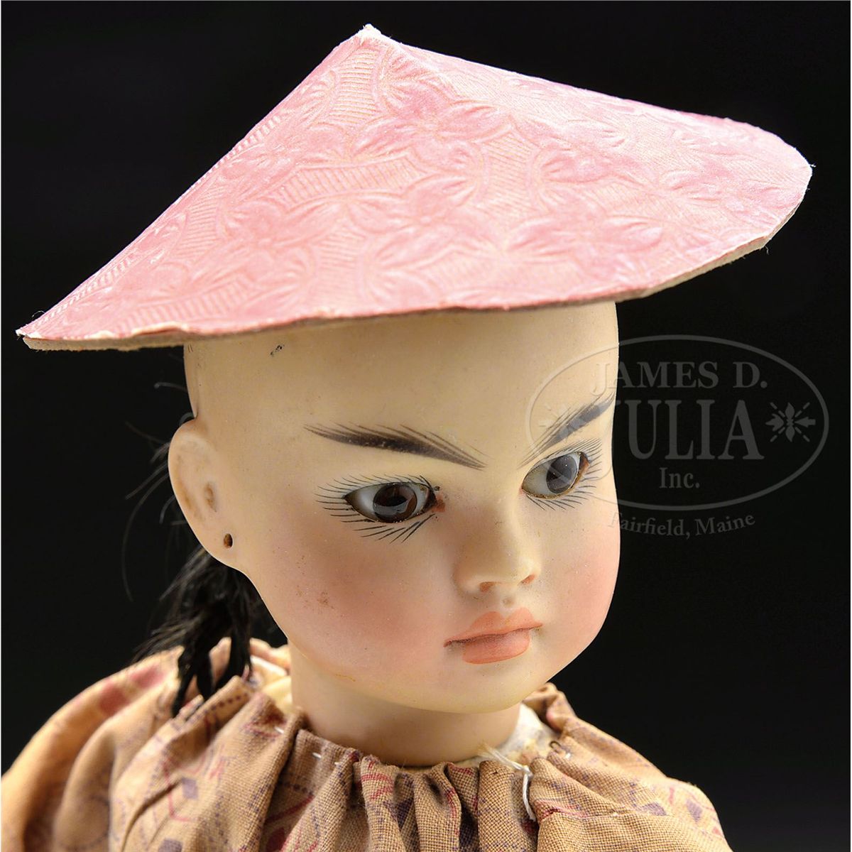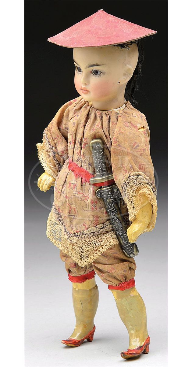 Extremely attractive amber bisque tinted head with solid dome, square cut flange neck, brown glass inset eyes, closed mouth with protruding upper lip, well painted multi-stroke eyebrows and tiny painted lashes, pierced ears, mounted to five piece body through three stringing holes in the top of the head. She has a heavy papier mache body with is jointed at the shoulders, hips, and knees and has molded and painted stockings and red slippers with separately molded heels and upturned toes. The simple costume appears to be original and is made of printed cotton with lace trim with a metal sword attached to the waist with a red silk ribbon. Completing the outfit is a realistically modeled cone shaped red paper hat over a sparse black mohair wig with long queue dangling in back. SIZE: 9-1/2" (24 cm). CONDITION: Very good with some typical discoloring to body. 1-13306