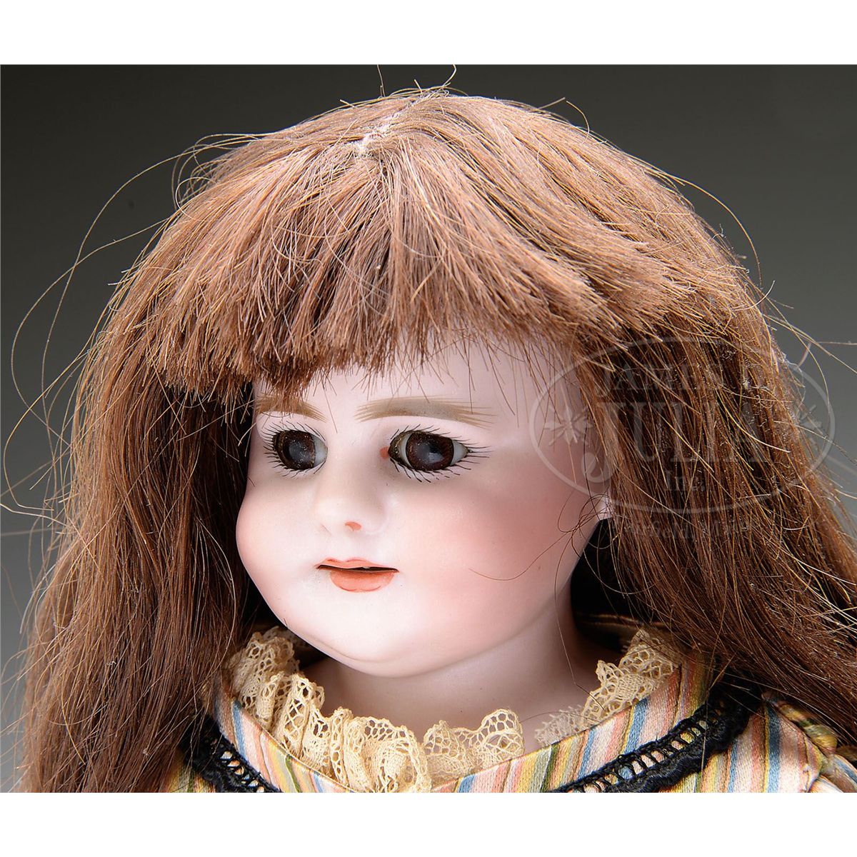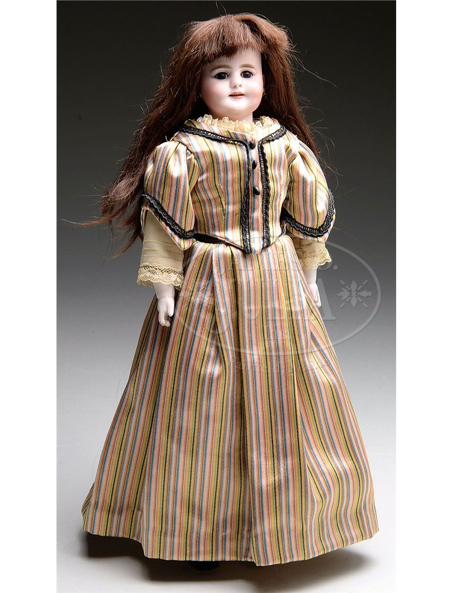 One piece head and shoulder with brown stationary glass eyes, open smiling mouth with six small upper teeth, deep dimples in cheeks and chin, pierced ears, most likely by Simon & Halbig, however, if marked, markings are obscured by leather glued over the edge of shoulder. She is on a white kid body with gusset joints at the hips and knees and has lower bisque forearms. The wig is dark human hair and she wears a lovely striped silk two piece dress with beige silk sleeves and lace trim. SIZE: 17" (43 cm). CONDITION: Very good. 1-13643