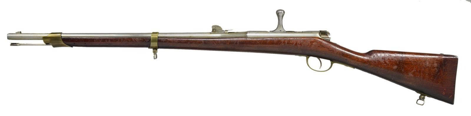 Cal. 11mm Mauser. S# 2186. Bbl. 23 7/8". Number matches on receiver, bolt & rear sight. All visible numbers match. First digit on receiver resembles 9 but is partly obscured "2". Open rear sight graduated to 1200m. Stud type front sight. Receiver has been cleaned, rendering markings obscure. Receiver markings visible on top left are "NTO" & "Suhl". Straight bolt handle. Unusually designed bolt is fitted w/ vertically pivoted thumb latch which locks bolt in place when closed & prevents striker from falling. Latch has heavy flat top checkering. Brass bbl. bands. Cleaning rod is present. Bottom sling swivels. Walnut stock w/ flat steel buttplate. Brass trigger guard. CONDITION: stock set has been refinished w/ loss of wood in inletted areas. Stock has been given coat of lacquer as preservative & has light wear, thinning, flaking & scratches throughout. Large repaired crack extending on right side between receiver tang & trigger plate. Metal has been heavily cleaned leaving wear & staining. Brass parts have pleasing period patina. Bore is shiny w/ strong rifling & scattered fine pitting. (01-19342/RW). ANTIQUE. $700-1,100.