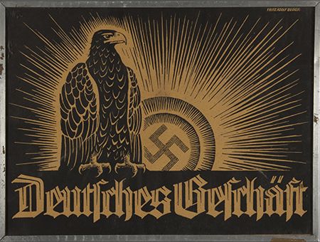 Paper placard, 9 1/2" x 7", black printing on an ochre background, shows a German eagle full length with a rising sun in the background, the sun bearing a swastika at its center. At bottom appears "German Business" in Gothic lettering. Printed by Fritz Adolf Becker, set into a thin aluminum frame. These placards were commonly displayed by businessmen in order that the public be assured that they were dealing with "Aryan" businessmen versus Jews. Very good.