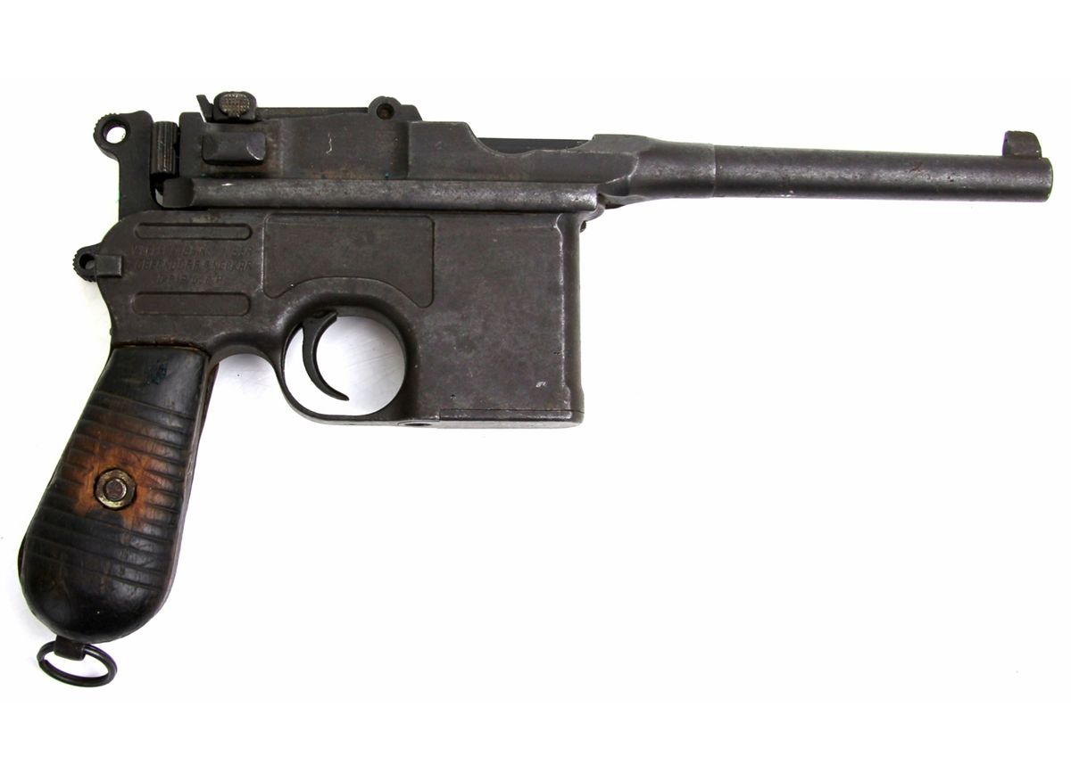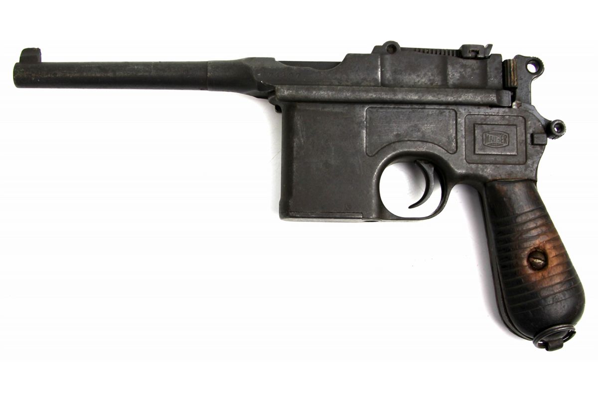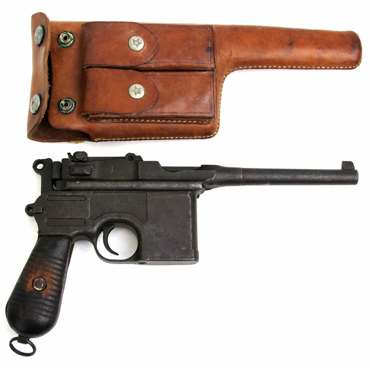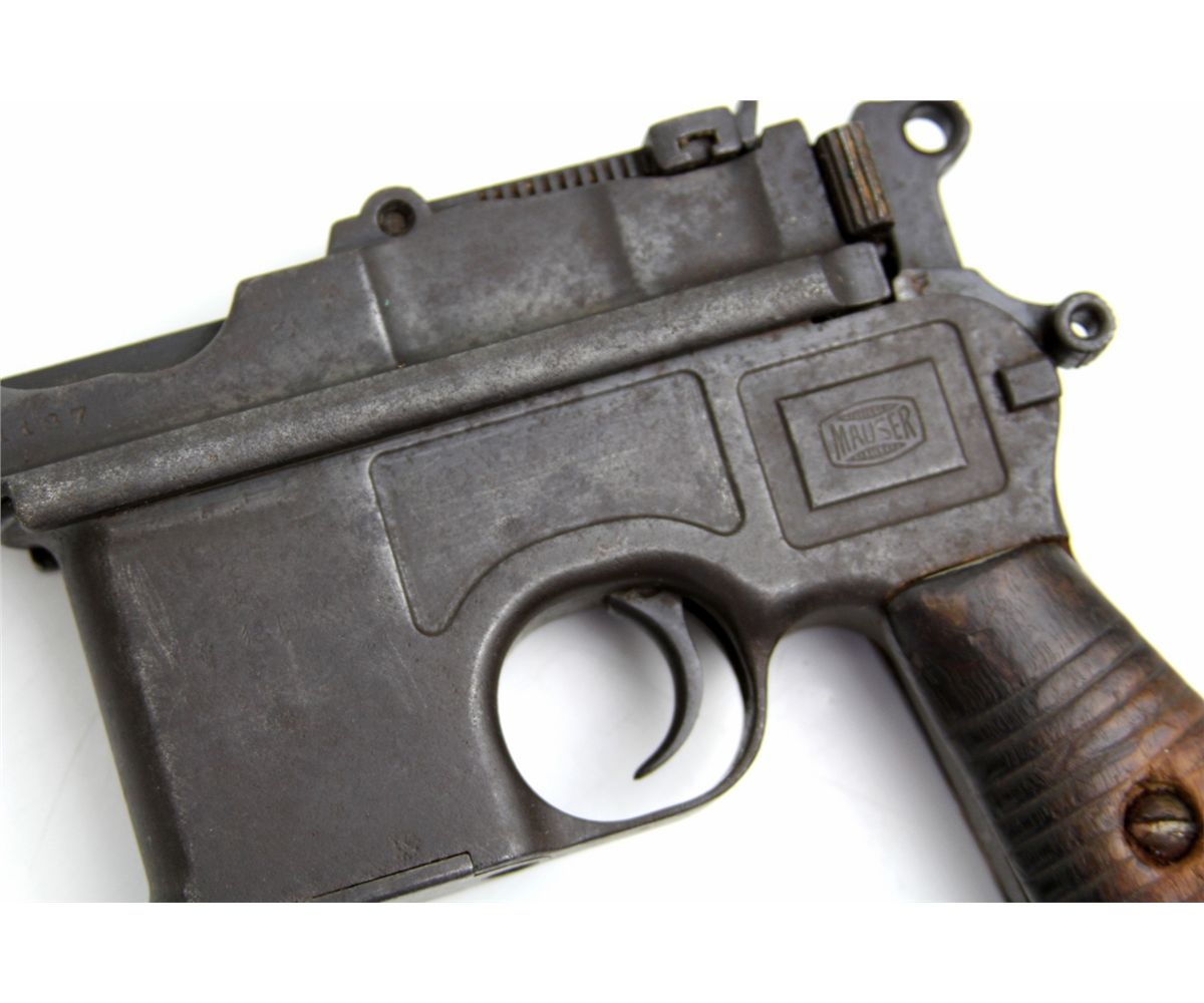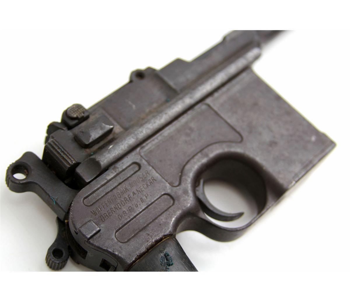 GERMAN C96 MAUSER PISTOL German C96 Mauser pistol. Marked "WAFFENFABRIK MAUSER OBERNDORF A NECKAR O.R.P. u. A.P." on right side. 1 line serrated grips. Later after market mid-century Chinese made holster included. Type: pistol Manufacturer: mauser Model: c96 Caliber / Gauge: 7.65mm Serial Number: 15148 Condition: Fair condition, showing most finish lost, wear to grips, and pitting.