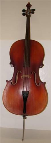 GERMAN CELLO. Marked with paper label on inside that reads “Copy of/Antonius Stradiuarius Cremonensis/Faciebat Anno 1721/Made in Germany”. Wood shows some signs of wear at edges. 59” H