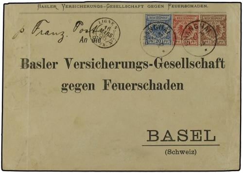 47b,48b,50c 1895 (March 16) Cover to BASEL (Switzerland) franked by Germany 10 pf., 20 pf. and 50 pf. tied by neat SHANGHAI cds´s, mailed via French Paquebot SAGHALIEN with circular LIGNE N / PAQ. FR. No 7 cds alongside (Salles 1921/7). BASEL arrival on reverse (April 19). Cover slightly trimmed at top. A rare three colour franking. Signed Bothe and Steuer.