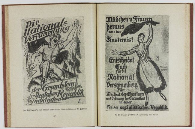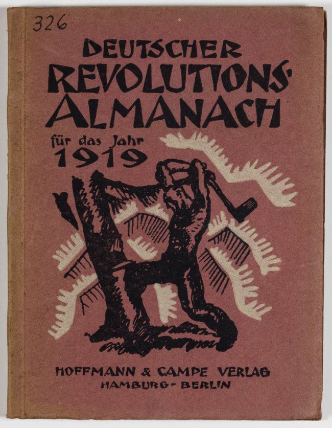 Rare post-World War I communist yearbook: "Deutscher Revolutions Almanach fur das Jahr 1919" (Berlin: Hoffmann & Campe Verlag), 1919. 164pp. 12mo. in cardboard. The frontis illustration shows a bare-chested man freeing himself from chains captioned "November 9, 1918", the day a republic was declared in Germany, seeking an end to the reign of Wilhelm II. The first few pages also bear illustrations of Marx, Engels, Liebnecht, Fritz Ebert, and others, a poem "Revolution", and a great deal of propaganda supporting noted communists. Fine.