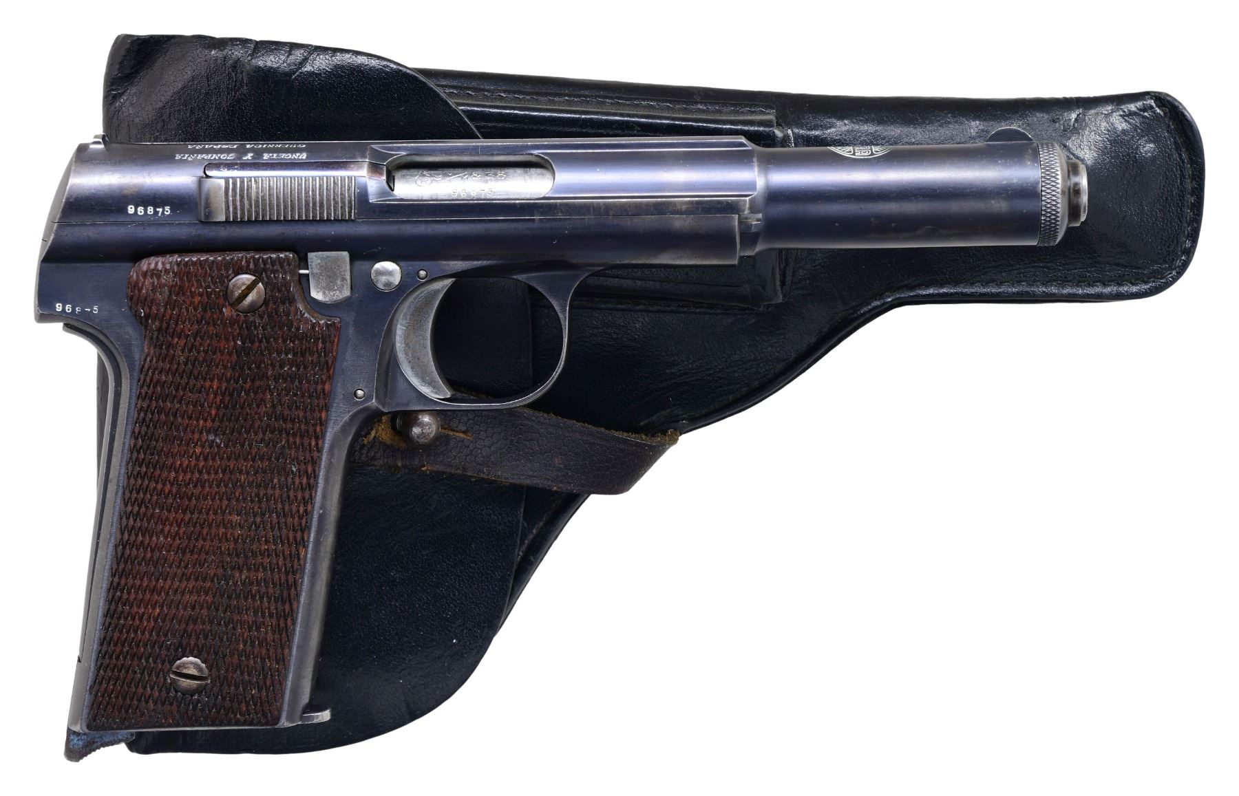 WITH EXCEPTIONALLY SCARCE ERSATZ PAPER HOLSTER. Cal. 9mm Largo. S# 96875. Bbl. 5 7/8". Model 400 (1921) semi-automatic pistol mfg. in Spain by Astra under contract for Germany during World War II. Top of the slide is marked with the Astra logo towards the front, with Astra's mfg. information, the cal. designation, and the model designation marked at the rear. Left side of frame and slide exhibit Spanish proofs. Metal components exhibit a blue finish overall, save for on the bbl., safety lever, and trigger, which are polished in-the-white. Frame is mounted with 2-piece checkered wood grips. Half-moon blade front sight, with U-notch rear sight. All serialized parts are matching and include the frame, slide, and bbl. MAGS: 3 8-rd. UNATTACHED ACCESSORIES: an extremely scarce and seldom encountered German Astra Model 400 Ersatz holster. Holster is comprised of laminated black paper, with a brown pebble grain leather closure strap. Holster is fitted with a former James D. Julia tag and has a note that reads "This Astra 400 ersatz holster is from the Warren Buxton collection. I bought it at Julia's Spring, 2018 auction.". CONDITION: very good, with metal components retaining the majority of their original blue finish, exhibiting areas of thinning and wear that show through to gray and brown patinas, as well as some spots of light to mild surface oxidation overall. In-the-white parts show scattered spots of age related discoloration. Bore is bright, exhibiting mild to moderate degrees of pitting, while retaining well defined rifling throughout. Grips show scattered marks and nicks to the diamonds, but otherwise remain sturdy and serviceable. Laminated paper Ersatz holster is very good, showing some scattered handling marks overall, with some mild delamination on either side of the closure flap. A nice German Astra Model 400 semi-automatic pistol, with a scarce and seldom encountered Ersatz holster. (24-6899/MLW). CURIO. $1,500-2,500.