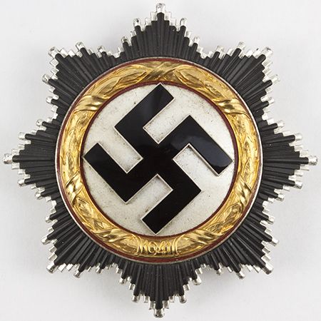 German Cross in Gold, light version, made by C.E. Zimmermann/Pforzheim. Uncleaned, flawless enamel on the swastika with no wear on the black ray plate finish. It is of late war manufacture and this particular example cross was most likely not awarded, but rather originates from the Praesidialkanzlei stock. The underside of the pin is maker stamped with the number "20". The case is in good condition with a small missing chip at the rear of the case, but not in a dominant spot. Overall excellent condition