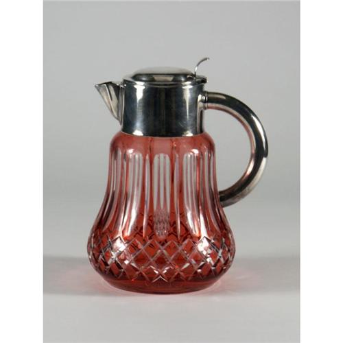 GLASS: German cut to clear cranberry glass water pitcher with silverplate collar, lid and handle, 10'' x 7'', marked ''Germany US Zone'' on collar, minor flea bites noted to some facets, 1940's.