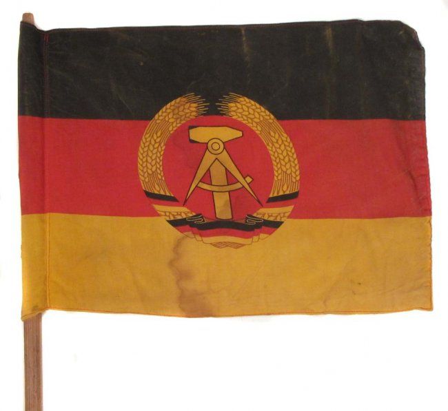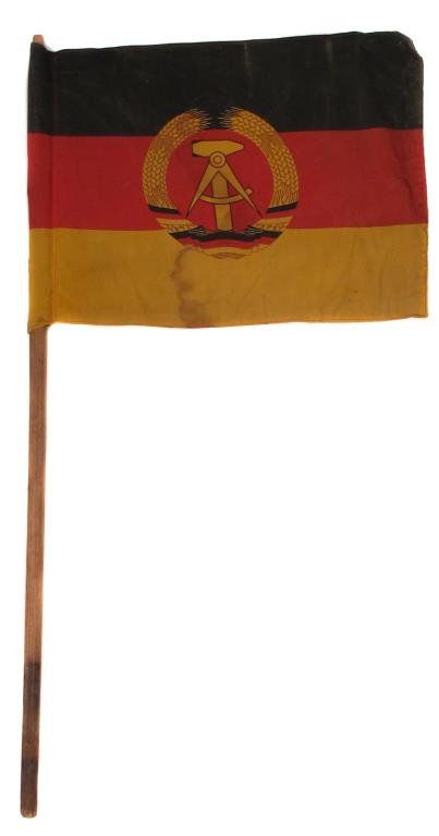 Cotton tricolor with emblem, on wooden haft.3rd quarter of the 20th century.Minor wear.Length of flag 48 cm.