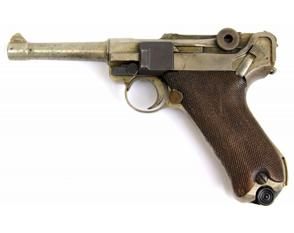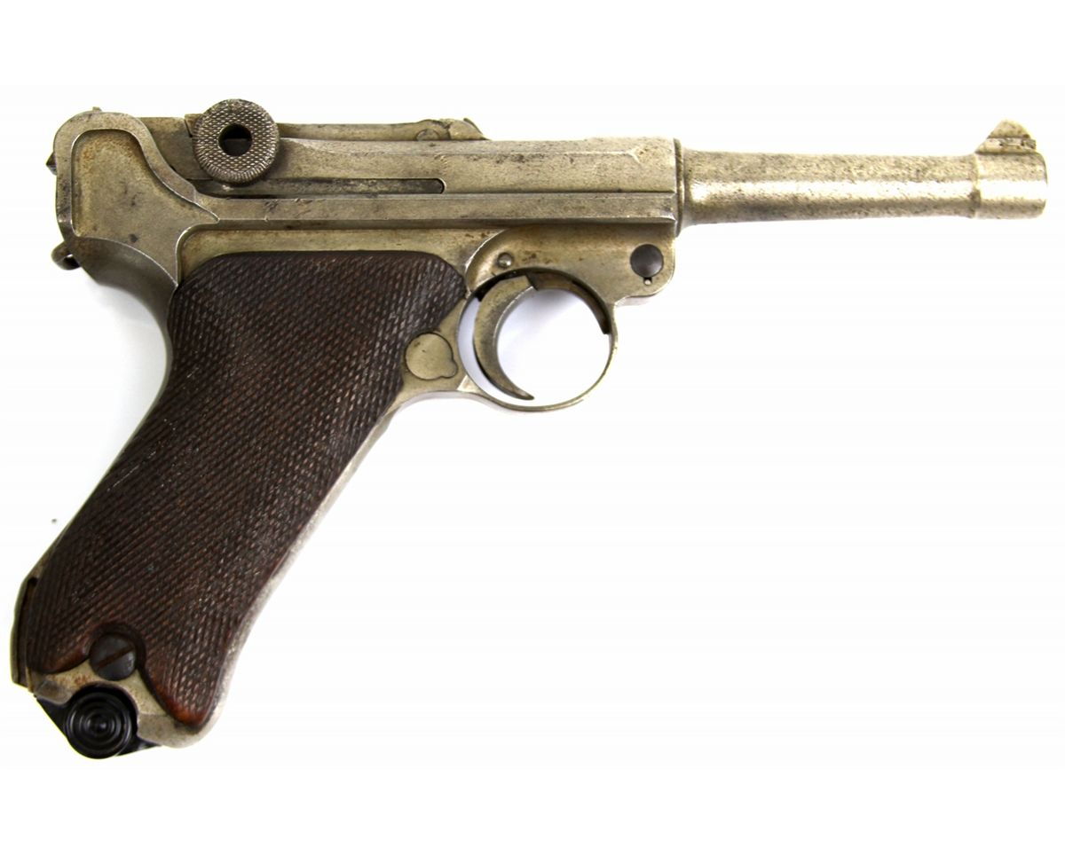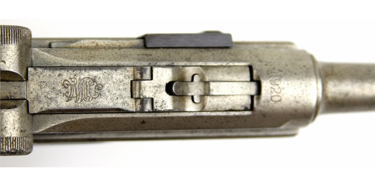 GERMAN DWM LUGER DATED 1920 NON MATCHING German P-08 Luger pistol marked DWM and dated 1920. Non matching numbered parts and modern replacement magazine. Leather holster and extra magazine included. Type: pistol Manufacturer: DWM Model: P-08 Caliber / Gauge: 9mm Serial Number: 7623 Condition: Non matching parts, fair bore, finish absent on most surfaces.
