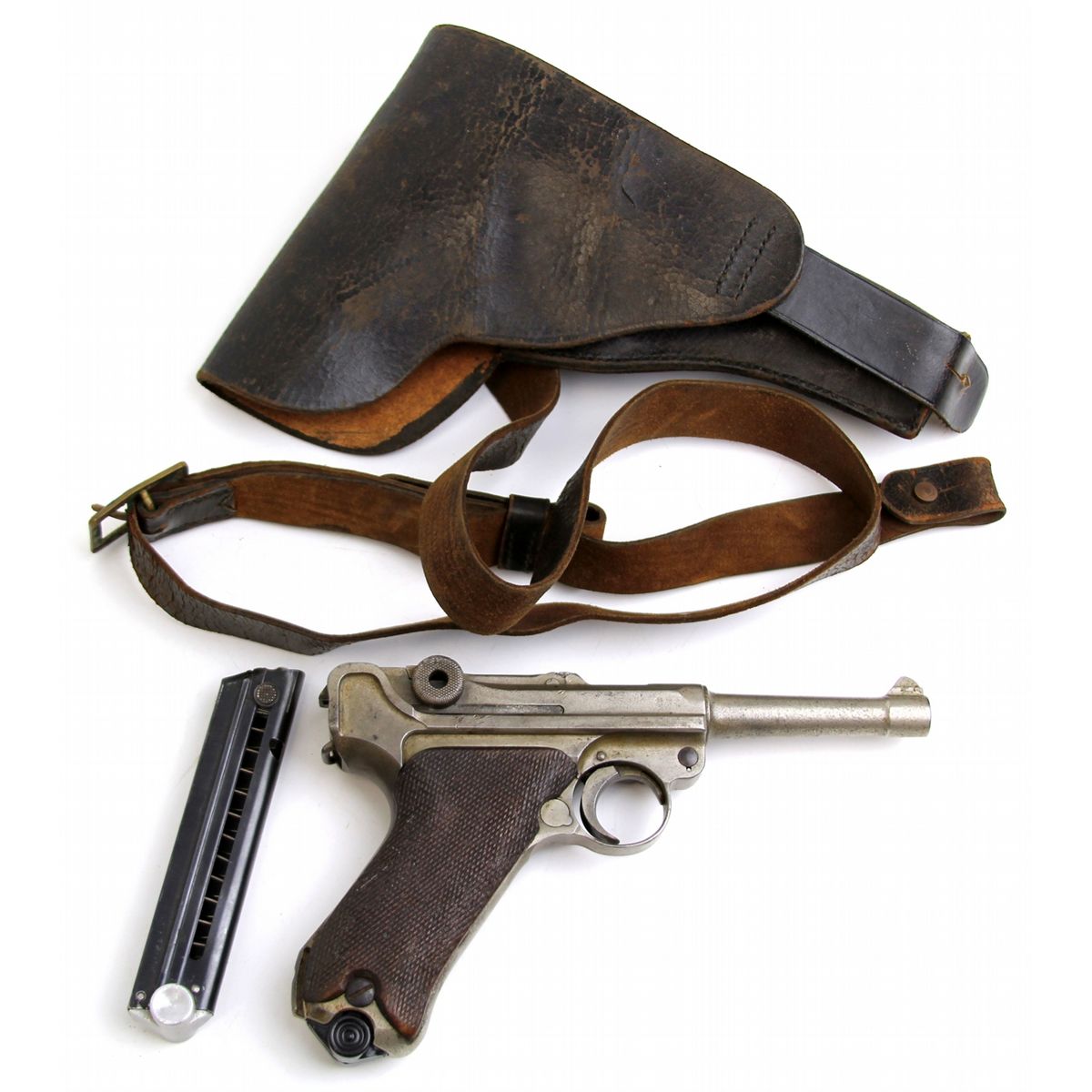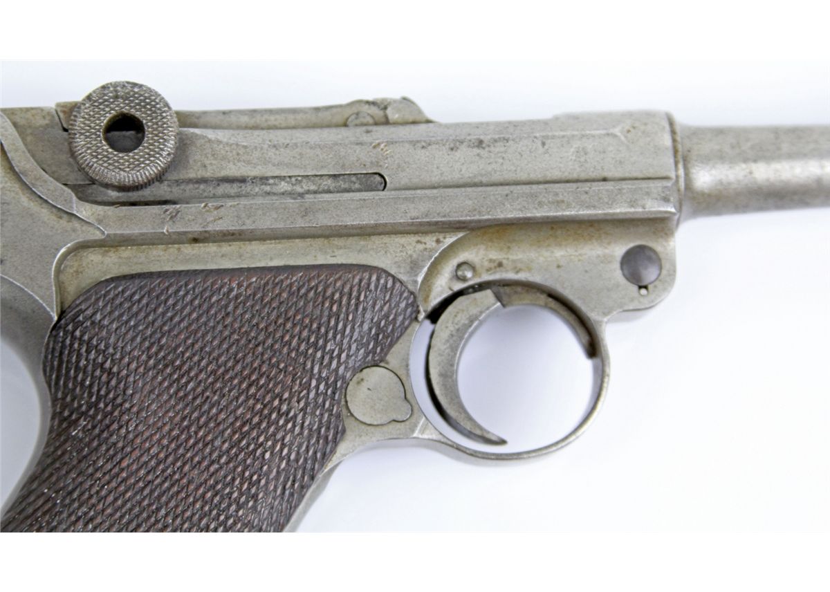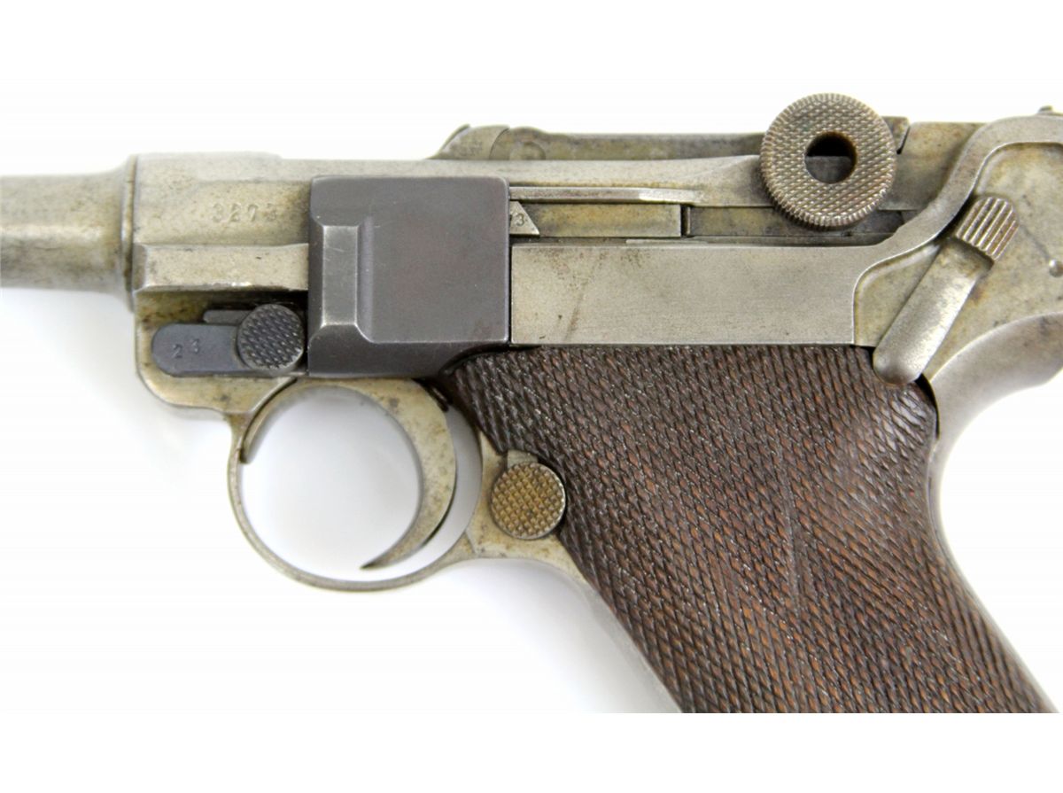 GERMAN DWM LUGER DATED 1920 NON MATCHING German P-08 Luger pistol marked DWM and dated 1920. Non matching numbered parts and modern replacement magazine. Leather holster and extra magazine included. Type: pistol Manufacturer: DWM Model: P-08 Caliber / Gauge: 9mm Serial Number: 7623 Condition: Non matching parts, fair bore, finish absent on most surfaces.