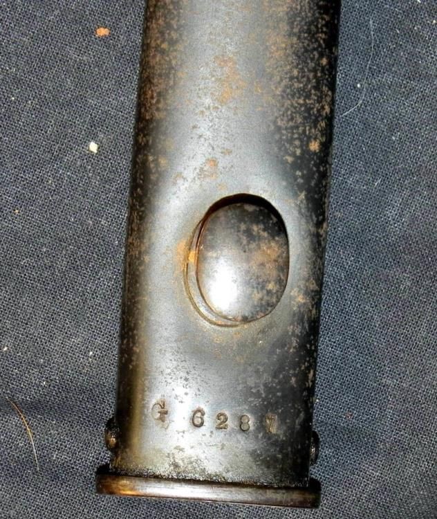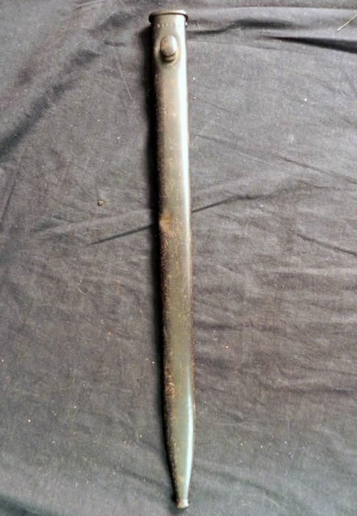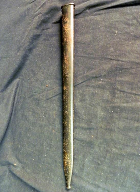 GERMAN(?) EARLY BAYONET SCABBARD-16"--#'D---DARKENED LONG SCABBARD---#8287--REVERSE HAS "D" WITH "X" IN CENTER OF D