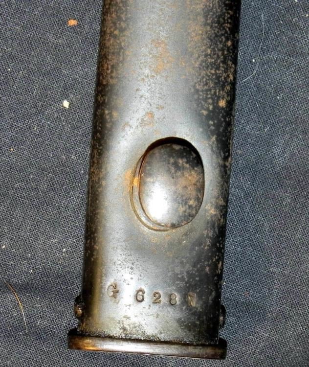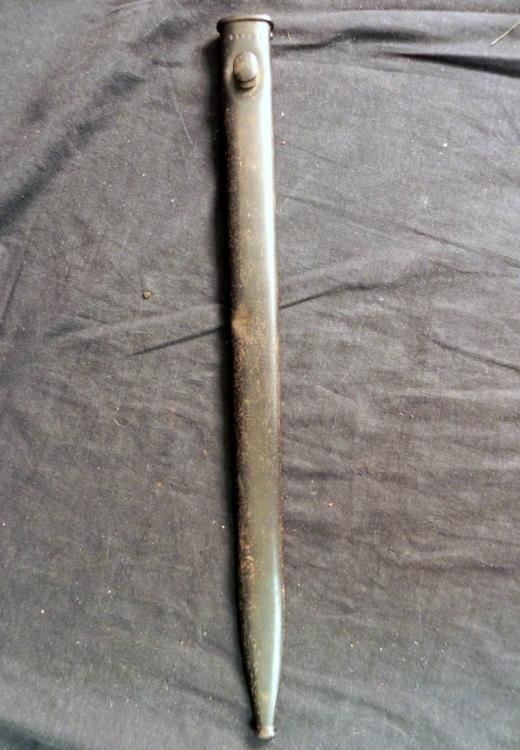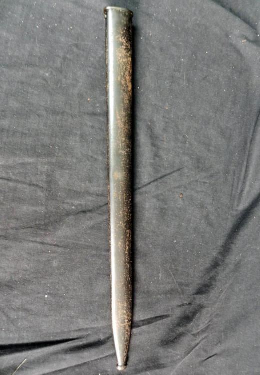 GERMAN EARLY BAYONET SCABBARD-16"--#'D---DARKENED LONG SCABBARD---#8287--REVERSE HAS "D" WITH "X" IN CENTER OF D