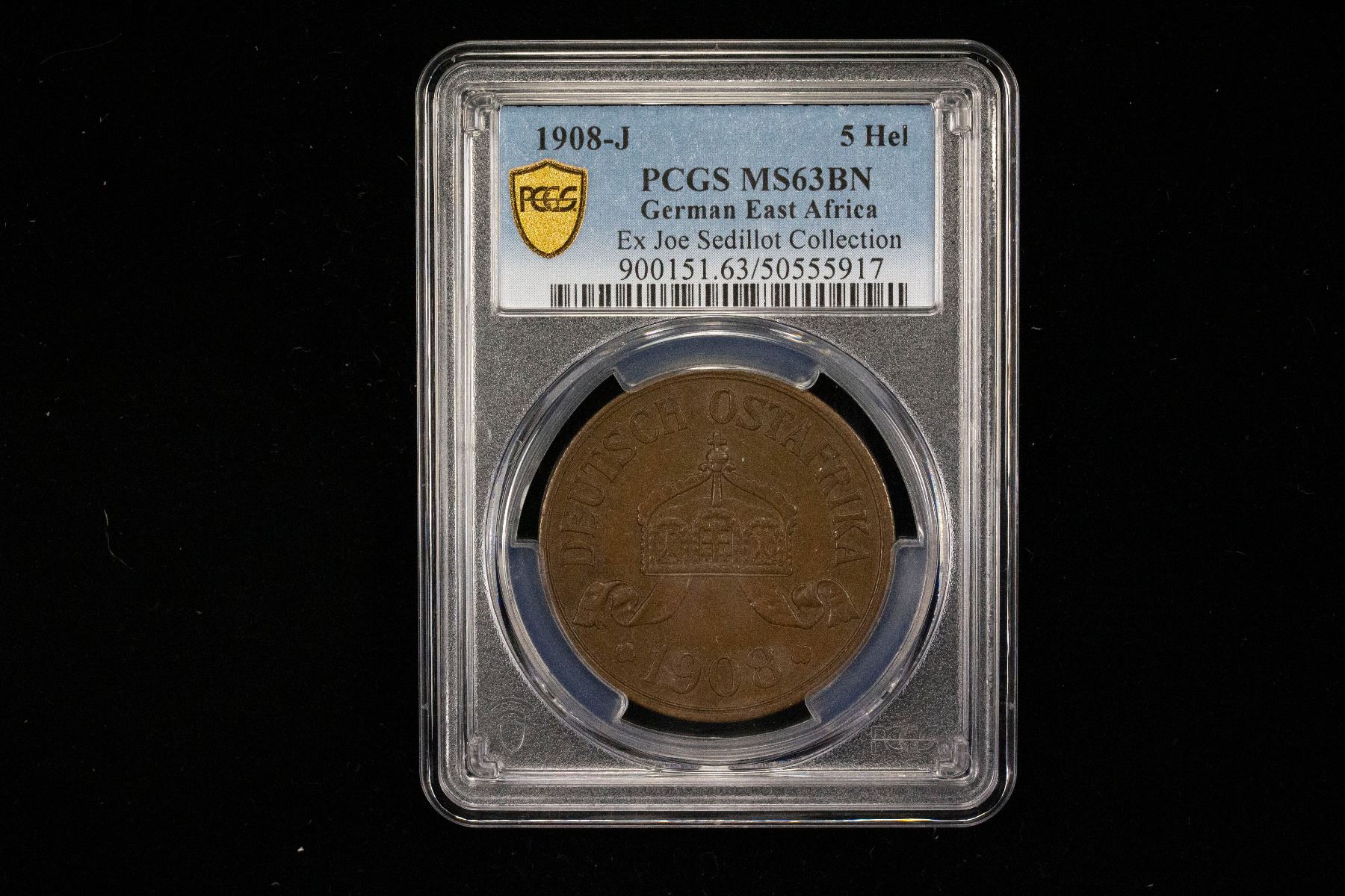 GERMAN EAST AFRICA: Wilhelm II, 1888-1918, AE 5 heller, 1908-J, PCGS MS63 BN