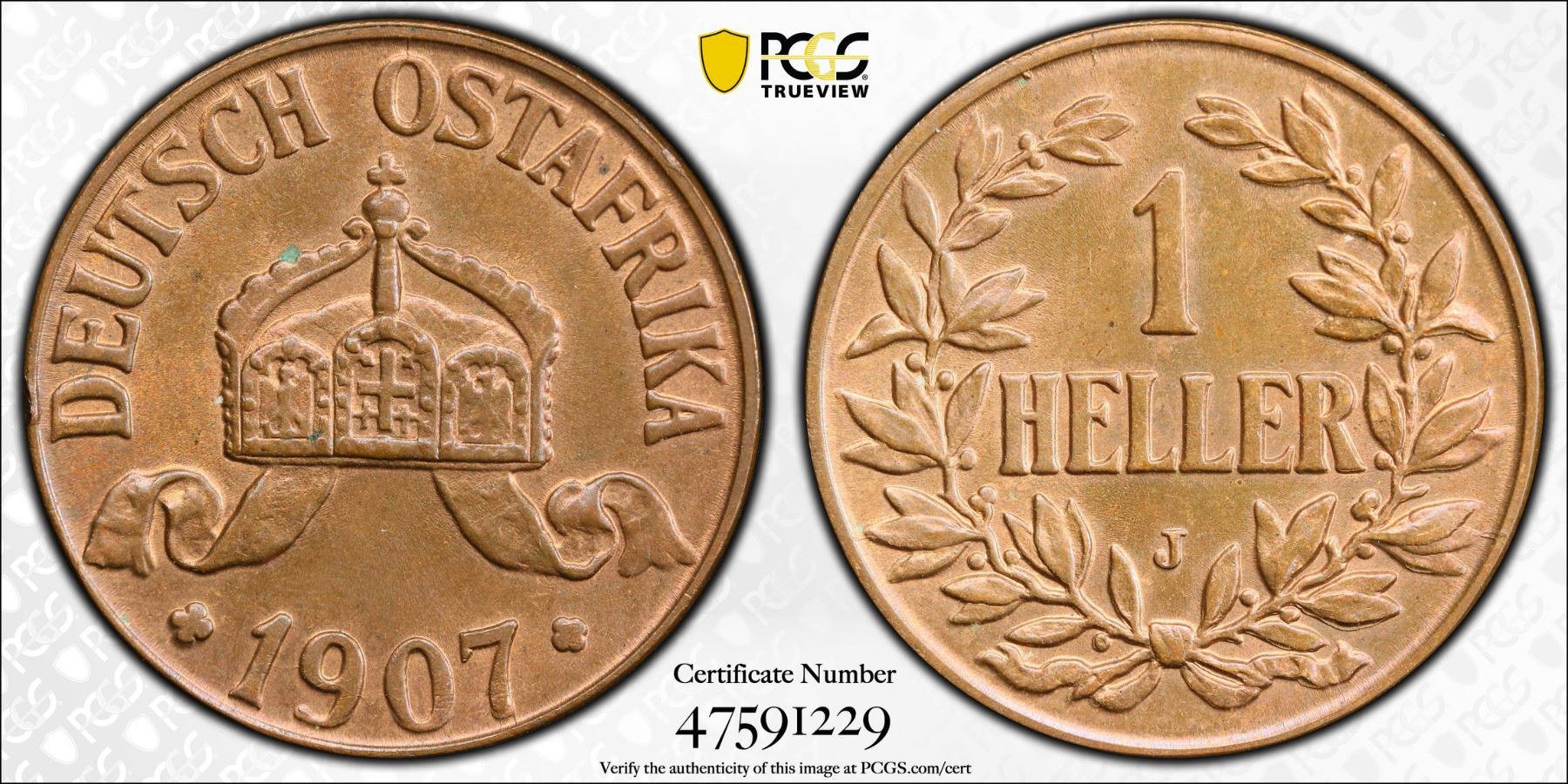 GERMAN EAST AFRICA: Wilhelm II, 1888-1918, AE heller, 1907-J, KM-7, delightful orange luster, a superb mint state example! PCGS graded MS65 RB.