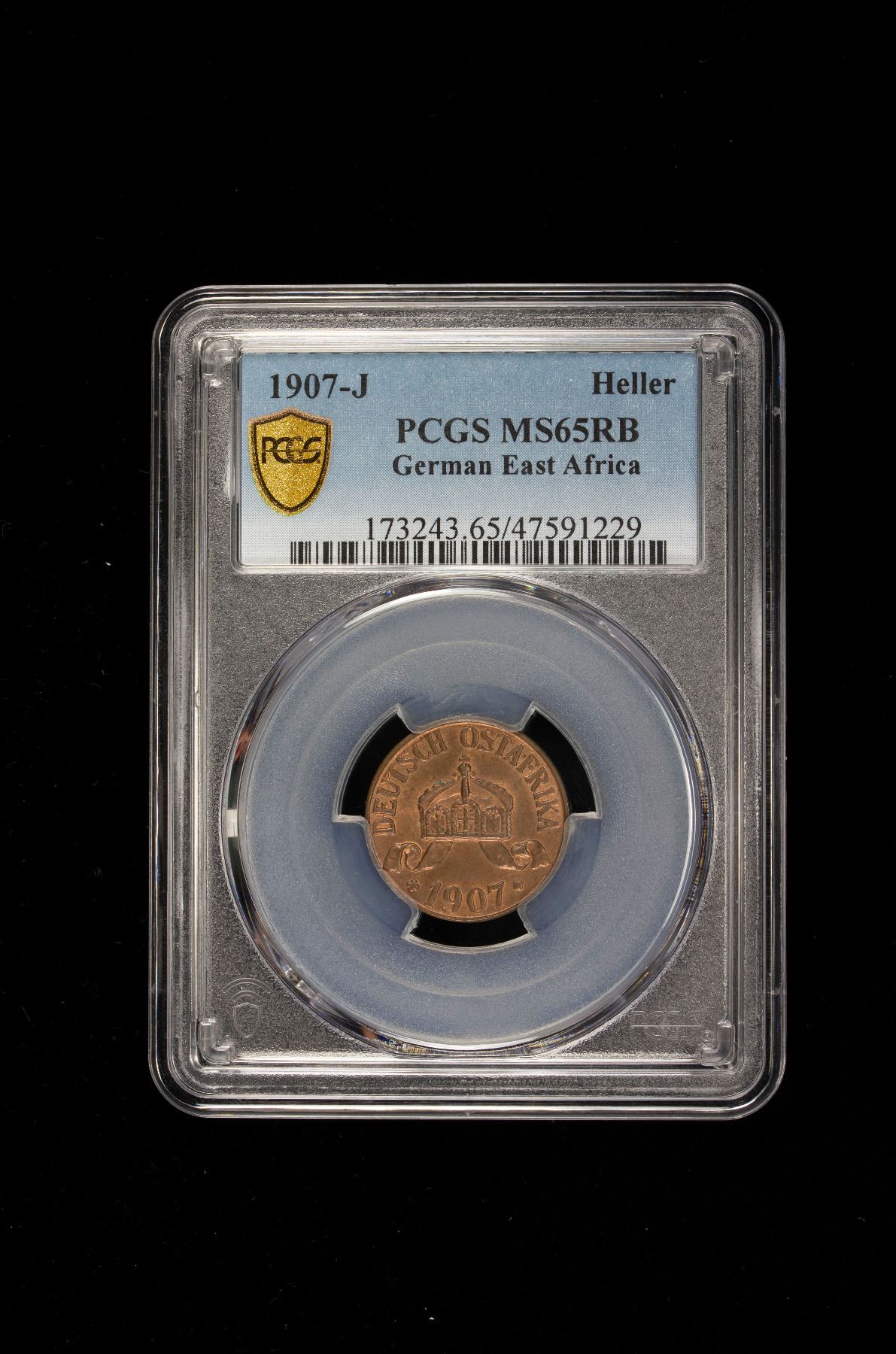 GERMAN EAST AFRICA: Wilhelm II, 1888-1918, AE heller, 1907-J, PCGS MS65 RB