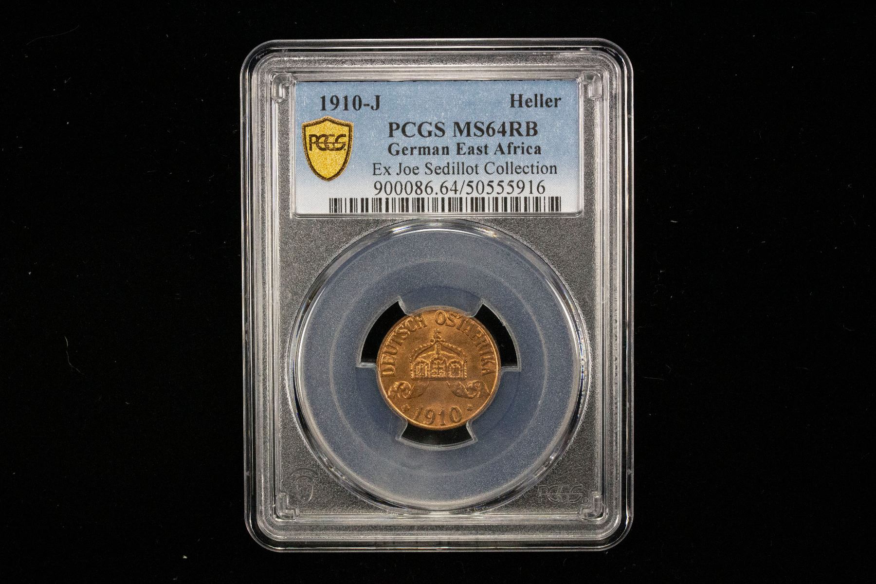 GERMAN EAST AFRICA: Wilhelm II, 1888-1918, AE heller, 1910-J, KM-7, a wonderful mostly red lustrous example! PCGS graded MS64 RB, ex Joe Sedillot Collection.