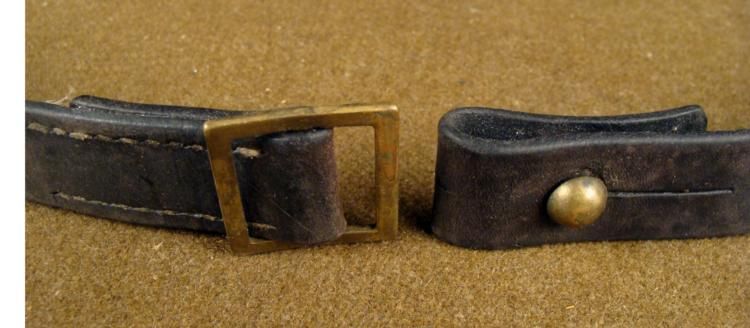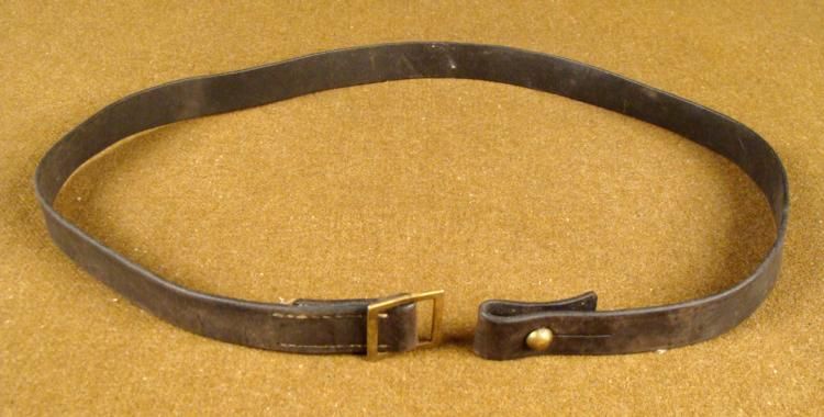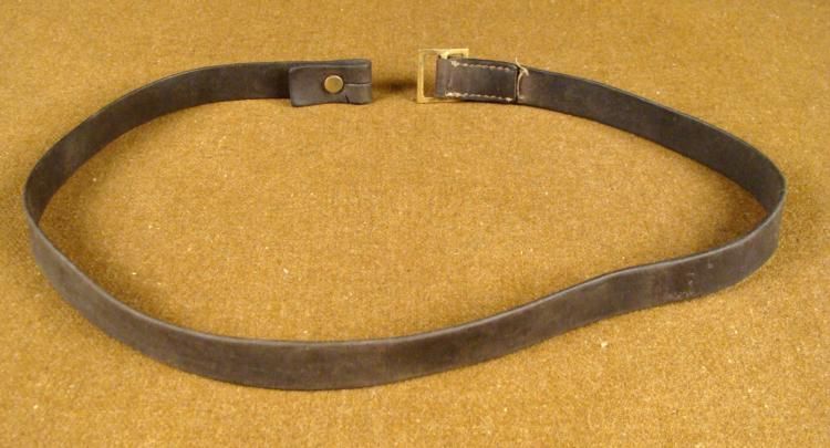 HERE IS A GERMAN EQUIPMENT LEATHER STRAP. ON ONE END IS A BUCKLE AND THE OTHER A STUD CLOSURE. IT IS 39" LONG AND IS IN EXCELLENT CONDITION. * * * *
