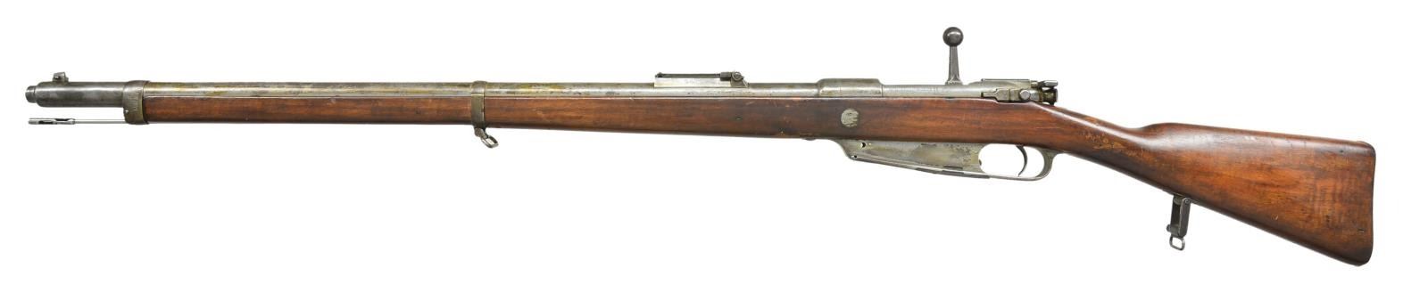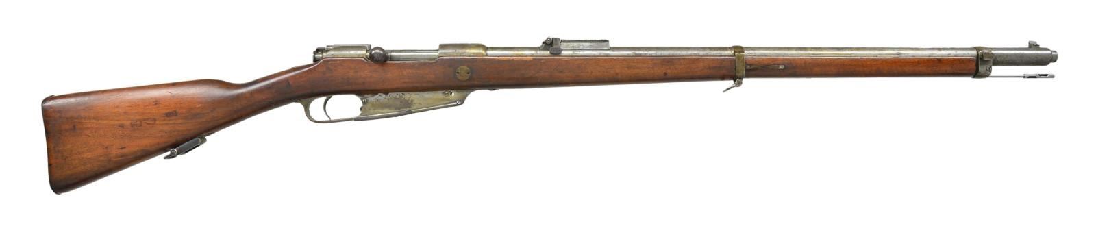Cal. 8mm Mauser. S# 432. Bbl. 30". Mismatched rear sight parts & bolt head. Other visible numbers are matching. "S" model w/ rear sight having rounded notch at top & right side of butt having an "S" marking. Top of receiver has 1890 date, Erfurt marking, "S" & "Z" markings indicating update to .323 bore diameter. Left side of receiver marked "G. MOD 88" & "NM" for New Material. Ladder rear sight graduated to 2000m. Blade front sight. Front band has cancelled unit marking that reads "131.R.E.D.4.174". Left side of receiver has "22.7.145" unit marking. Walnut stock. Stock has faint Imperial stamps. Cleaning rod present. CONDITION: sanded walnut stock shows added varnish w/ notable cracks on both sides of wrist. Stock otherwise shows scattered dings & handling marks. Metal has a silvery-gray cleaned appearance w/ scattered oxidation & some light pitting. Fair w/ scattered light pitting. (01-22253/MJC). ANTIQUE. $300-500.