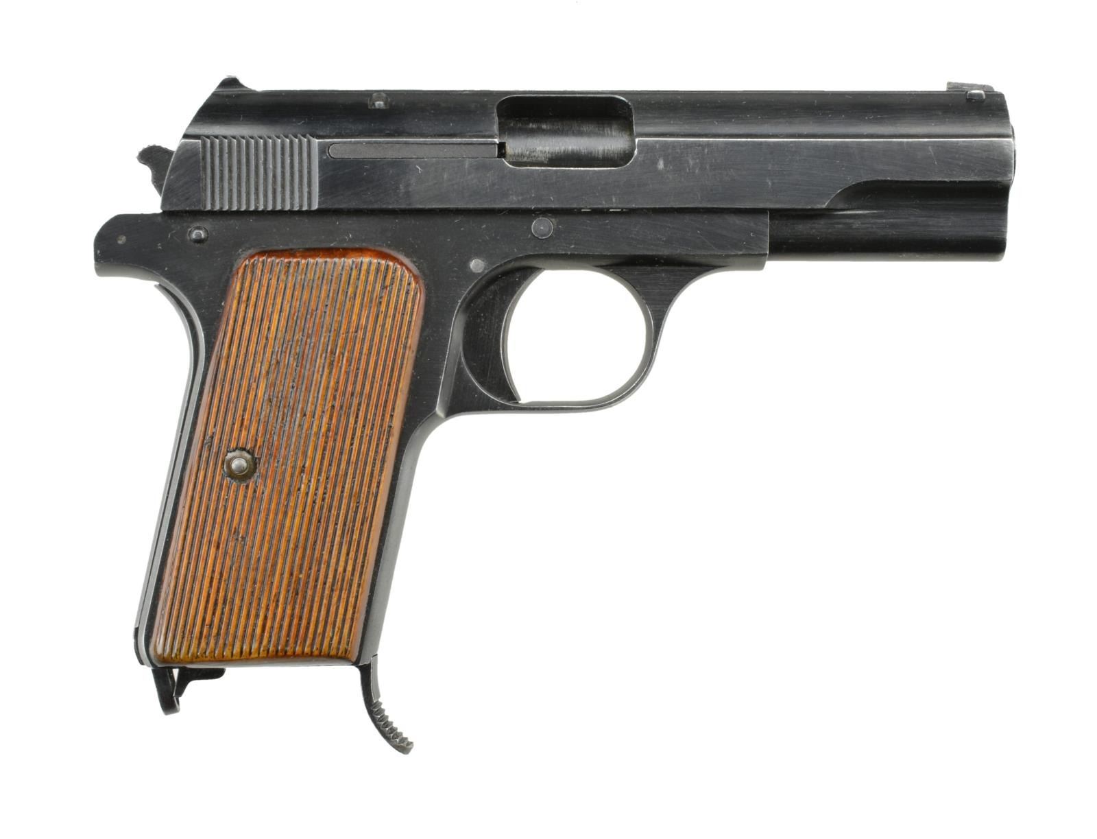 Cal. 7.65mm (32 ACP). S# 45764. Bbl 4". Matching numbers on slide & bbl. Left side of slide marked w/ "P. Mod. 37, Kal 7,65.", a German eagle & "jhv/41". Left front of trigger guard marked w/ eagle WaA58. Grooved bakelite grips. MAGS: 2-8 Rd. marked "P.Mod 37" & both have mismatched numbers. CONDITION: grips show some scattered light dings & flaking finish on bottom. Metal retains 90% original blue w/ some high wear & light freckling on both straps. Very good bore. (22-2428/MJC). CURIO. $500-800.