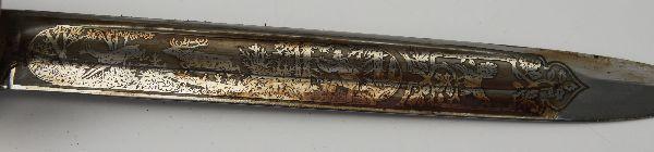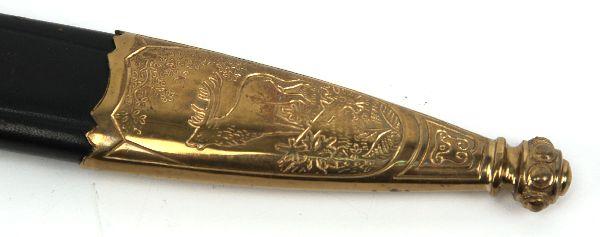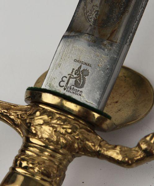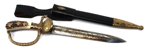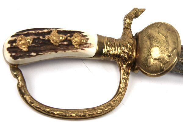 German senior forestry cutlass, complete with scabbard and frog. Maker marked Original Eickhorn, with squirrel trademark. Gilt brass hilt fittings, with clamshell guard featuring a game bird, and hoof quillon. Antler grip with gilt brass acorns on each side. Blade etched on both sides with detailed hunting scene, as well as oak leaves etched down the back of the blade. Leather scabbard, with engraved gilt throat and chape, acorn stud, and leather frog attached. 10 inch blade remains coated in cosmoline. Overall excellent condition.
