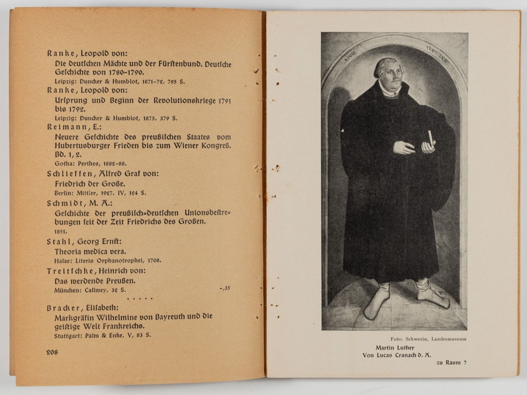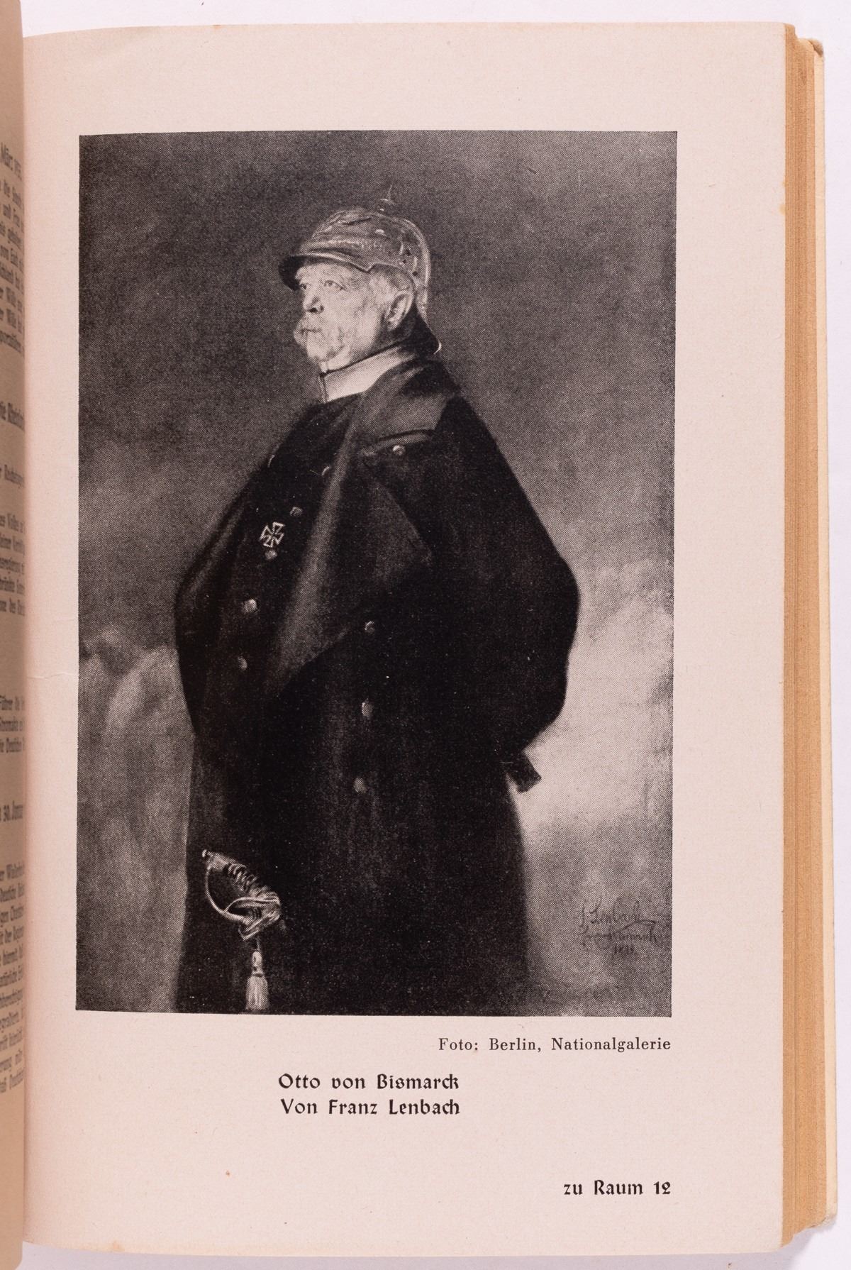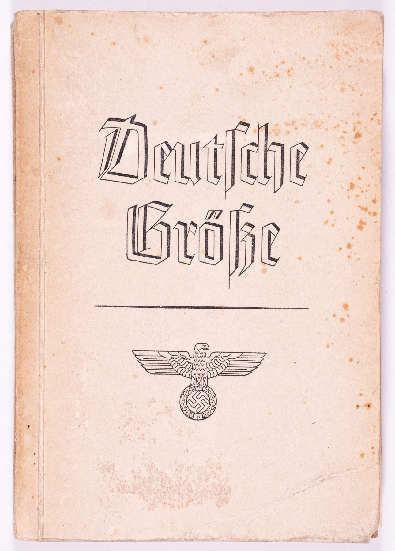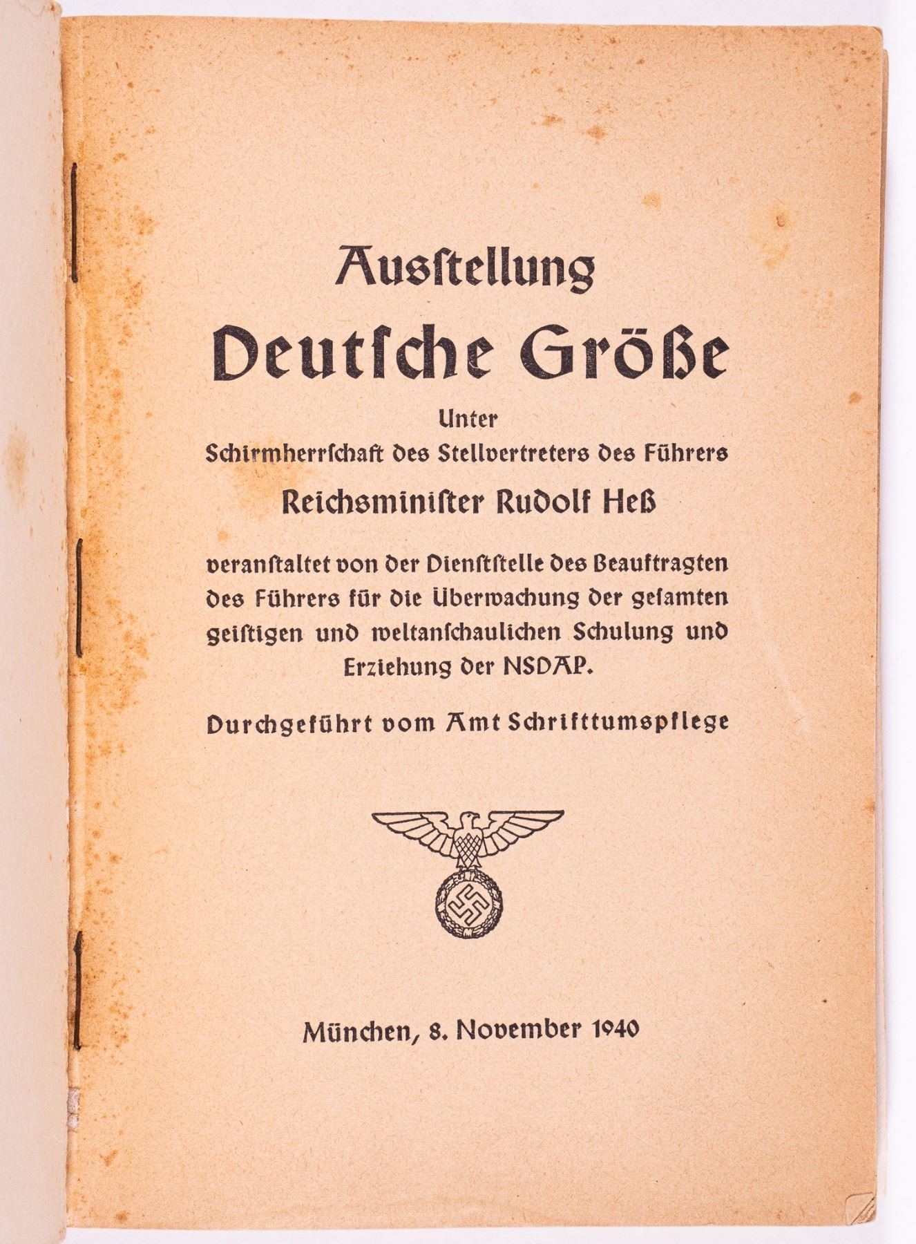 German exhibition catalog 'Deutsche Groesse' (German Greatness), Munich, 8. November 1940, 395 pages, staple bound, 7.25 x 5 inches. Published for the art exhibition held in Munich showcasing many pieces of great German art. The event was sponsored by Rudolf Hess and organized by Alfred Rosenberg. Few original pieces were shown except for sculptures by Arno Breker and Josef Thorak. The other 2,000 or so pieces were facsimiles of the original items, put on display for the German public. The exhibition went on to run annually from 1938 to 1944. Foxing and loose pages.