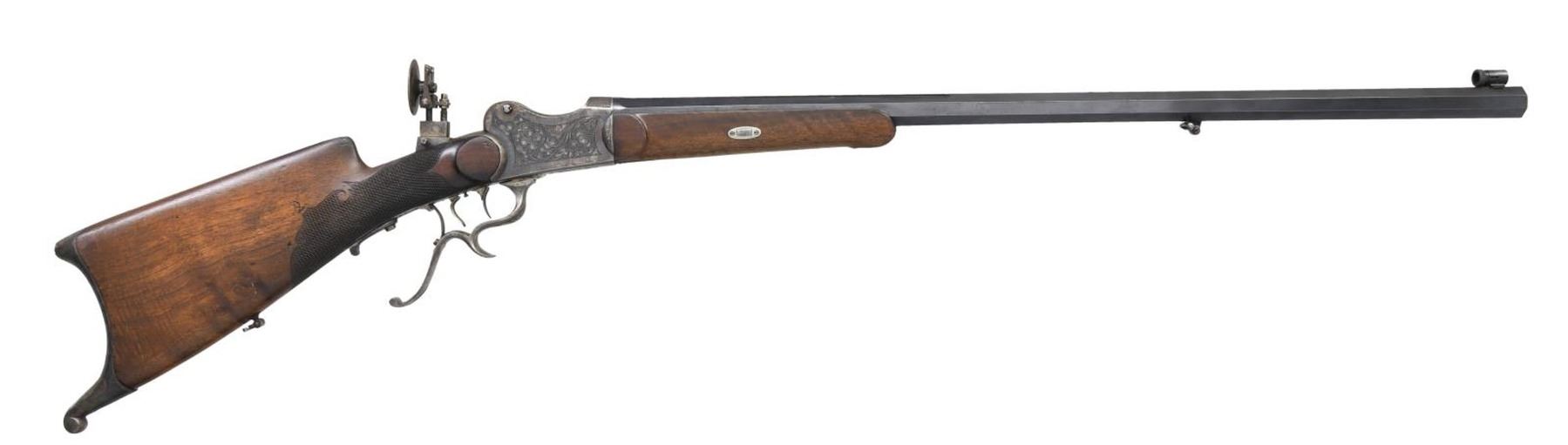 Cal. 8.15x47R. S# 22. The 31" heavy octagon barrel has matted top flat which has expanded area toward rear for attaching dovetailed barrel sights. Case hardened Martini action with removable firing group is engraved with panels of large open flowing acanthus. No maker's name is present. S# appears on operating lever and original windage and elevation adjustable tang sight. Offhand buttstock of lightly fiddle figured European walnut has heavy hooked buttplate and swept right hand cheekpiece. Grip is checkered. Matching schnabled forend attaches to barrel with side bolt. Bottom of barrel under forend is stamped with BUG proofs and 5/27 proof date. CONDITION: very good. Metal with most original finishes and a large amount of rust staining and some light pitting. Stocks retain most of their original finish with many marks. Bore is good; considerably frosted. Mechanically good. (23-5340/MGM). CURIO. $1,500-2,000.