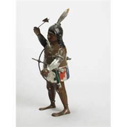 Lot # 746 GERMAN HAND PAINTED INDIAN. Tin hand painted toy depicts an American Indian with bow and arrow and tomahawk. SIZE: 7-1/2" t. CONDITION: Good overall with quite a bit of flaking to skirt. Right arm has been replaced. 1-29280 (100-200)